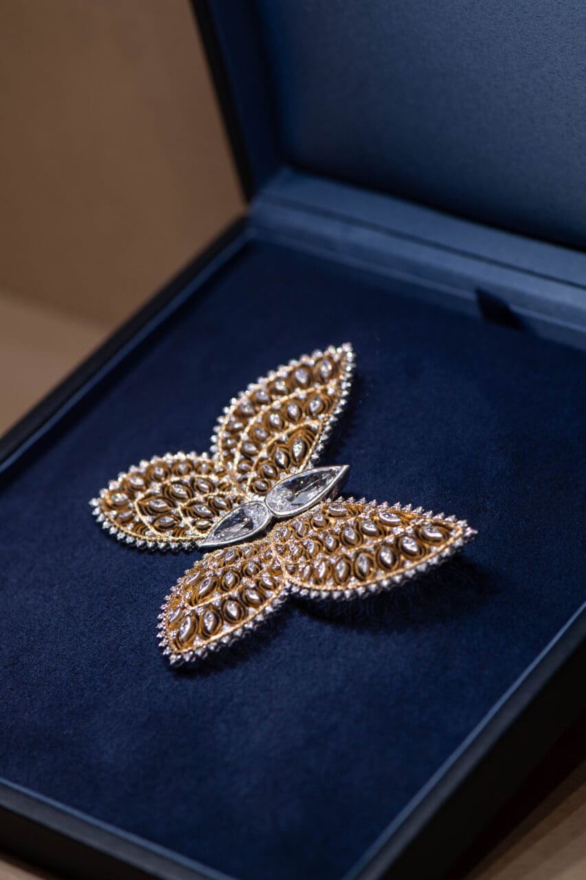 Andrea Buccellati 與女兒共同設計的蝴蝶造型胸針,巧妙融合多種品牌獨有的匠心工藝如 Openwork「鏤空工藝」和 Tulle「珠羅紗」工藝等。