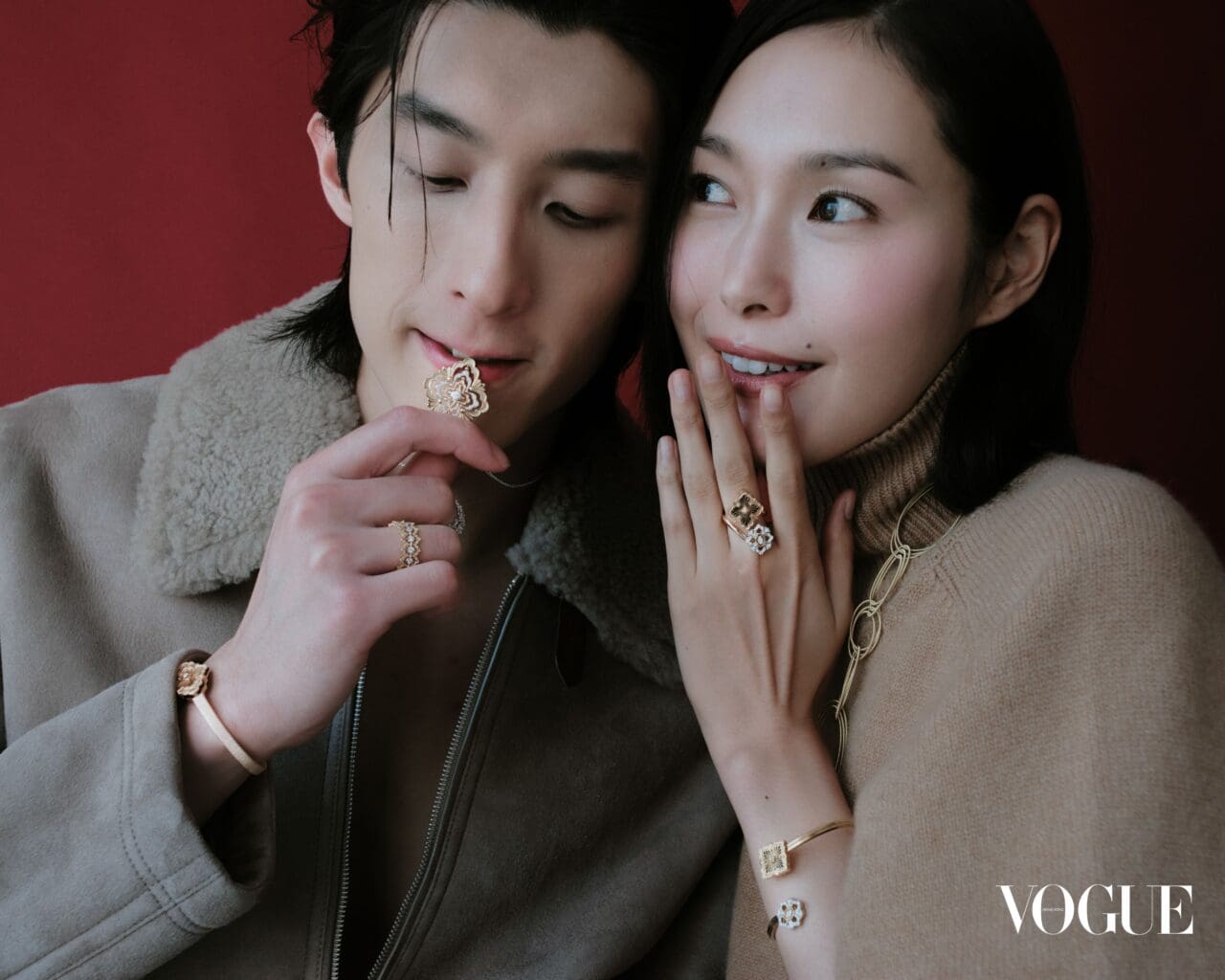 On Carson: Opera Galileo pendant in yellow and white gold with diamonds, Opera Tulle bracelet in rose gold with onyx and Rombi Eternelle rings in gold with diamonds, all Buccellati. Jacket, Berluti. On Myu: Opera Tulle ring and bracelet in rose gold and white gold with onyx and diamond and Hawaii Oval necklace in yellow gold, all Buccellati. Top, Fendi.