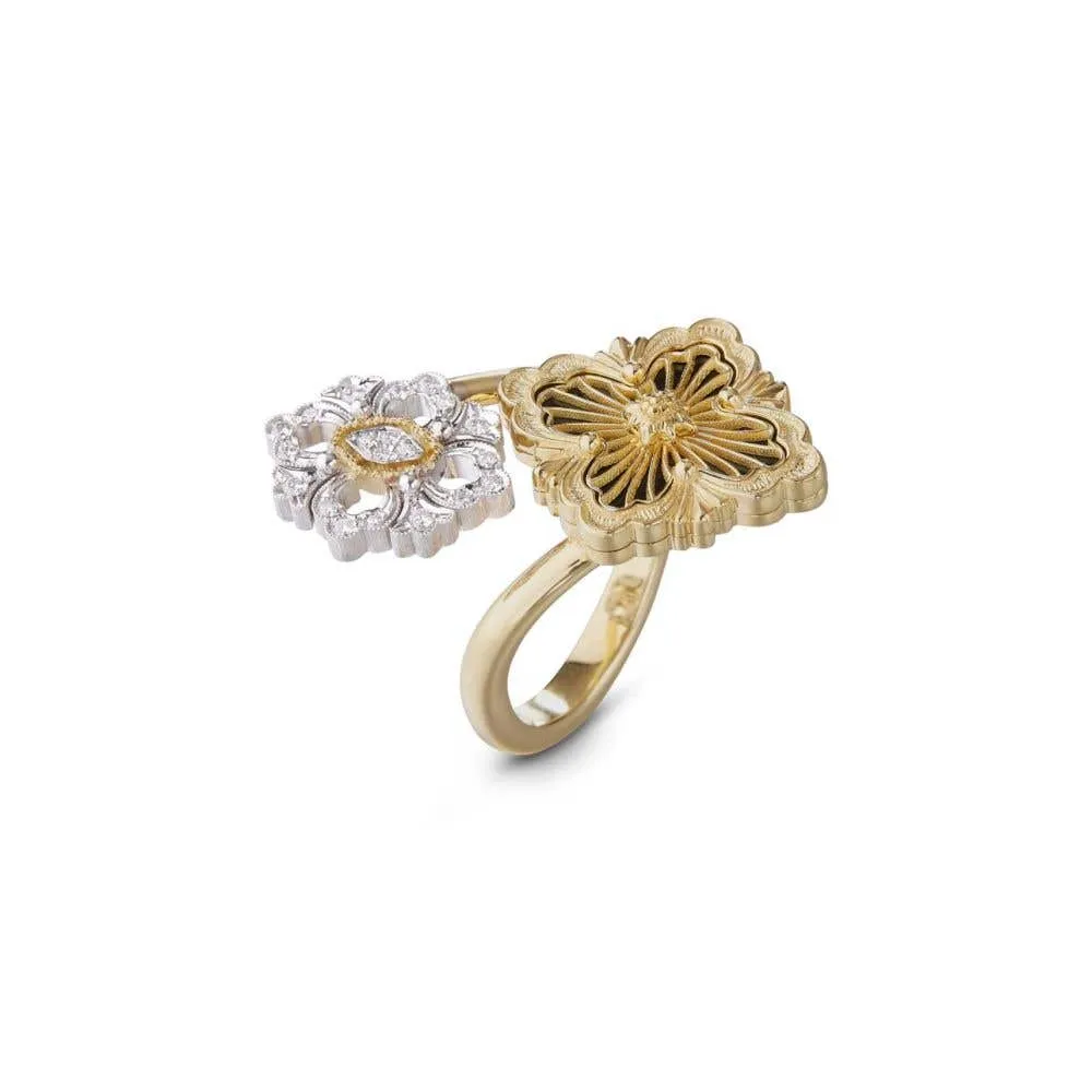 Rombi系列的靈感源自文藝復興時期的美學,把大自然元素轉化為幾何線條並構成菱形設計。此系列的作品以鏤空設計呈現,配合Modellato工藝,以高浮雕方式營造華麗的立體效果。每個細節都顯示Buccellati對於工藝的極致追求。像是Rombi Eternelle戒指,便以扇形黃金鑲邊,在白金上鑲嵌鑽石,散發無可比擬的光芒,在聖誕佳節綻放無限魅力。