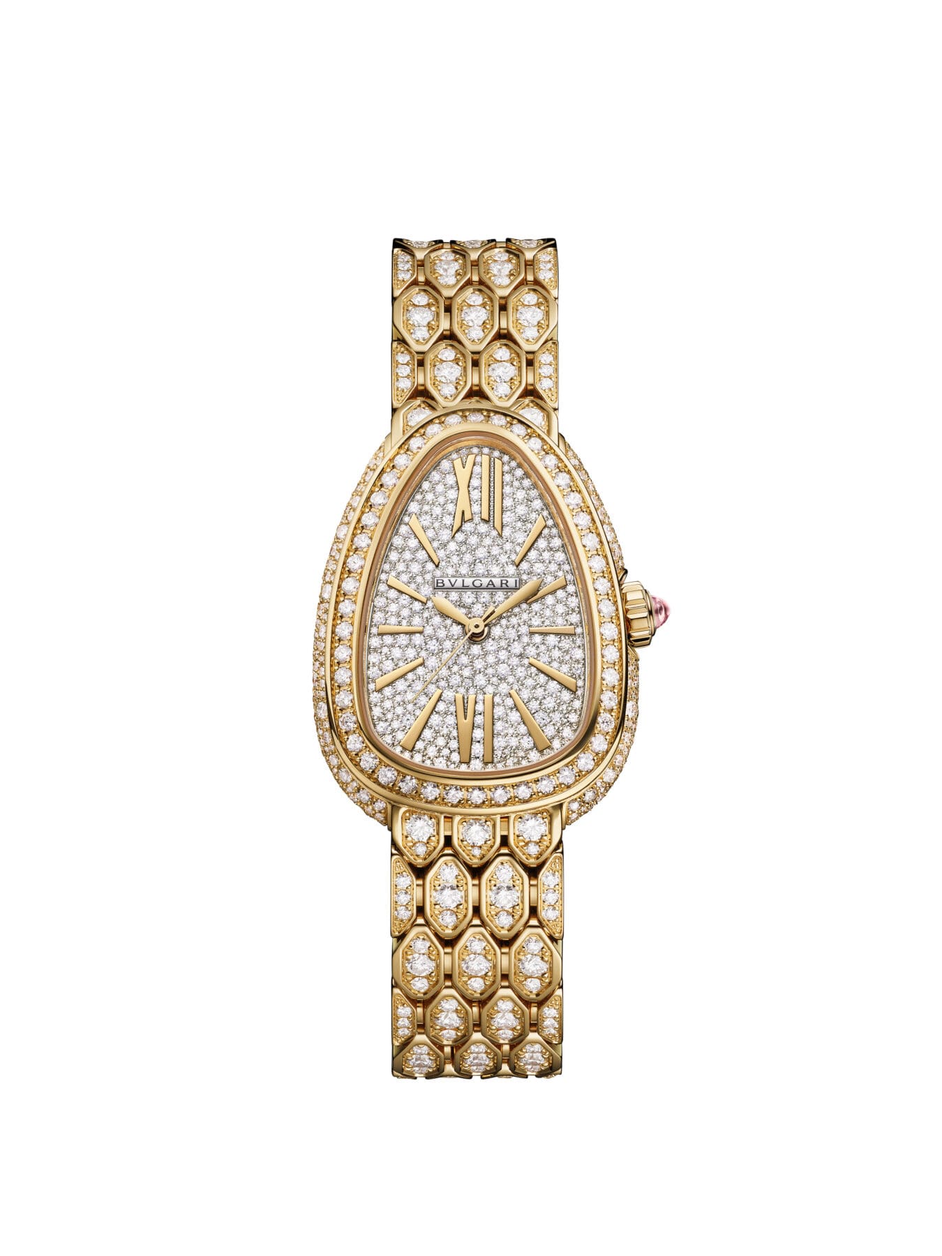 新版本的Serpenti Seduttori腕錶的34毫米錶殼和錶帶以多種材質演繹,像是黃金、玫瑰金、白金和精鋼等,錶圈則鑲嵌上鑽石裝飾。在置入全新機芯後,每款Serpenti腕錶均具備時、分、秒顯示,而白色蛋白石或黑色漆面錶盤上清晰的「Automatic」字樣展現其自動機械機芯的身份,透明的藍寶石錶底則盡情釋放了機芯擺陀的迷人動態。擺陀上飾有「BVLGARI」和7片蛇鱗,象徵着Serpenti系列腕錶的生生不息。錶冠更鑲崁一顆質感豐富的凸圓形切割紅碧璽或藍寶石,增添整體奢華感。