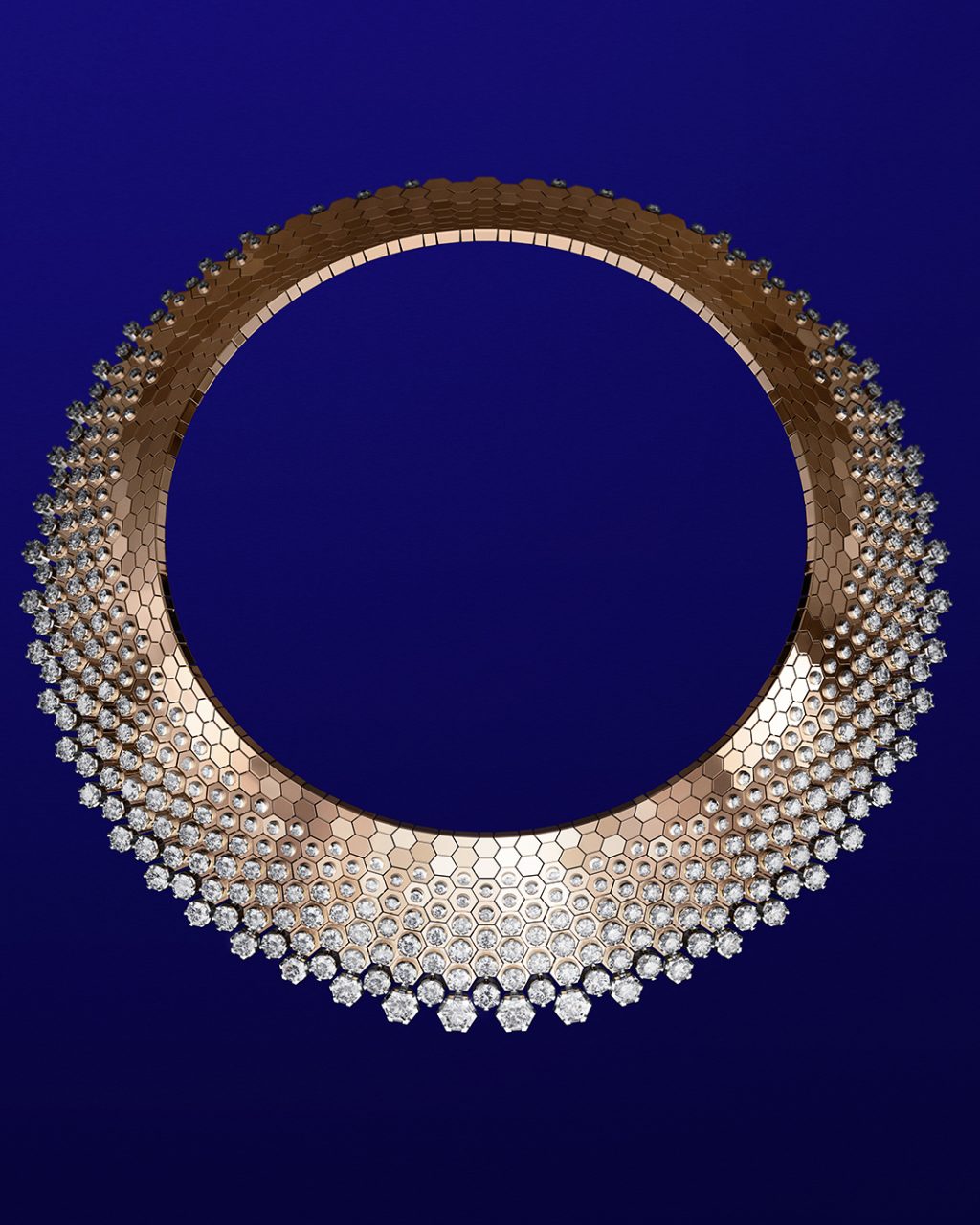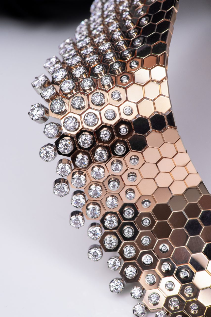 Chaumet Bee My Love系列新成員BIB項鏈由410克黃金,經手工雕刻、組裝和拋光而成,用上750小時精心製作而成。695個精緻的黃金鏈節,與390顆漸變排列的明亮式切割鑽石以及10顆皇后式切割(Taille Impératrice)鑽石熠熠生輝,猶如蜂群在陽光下翱翔。