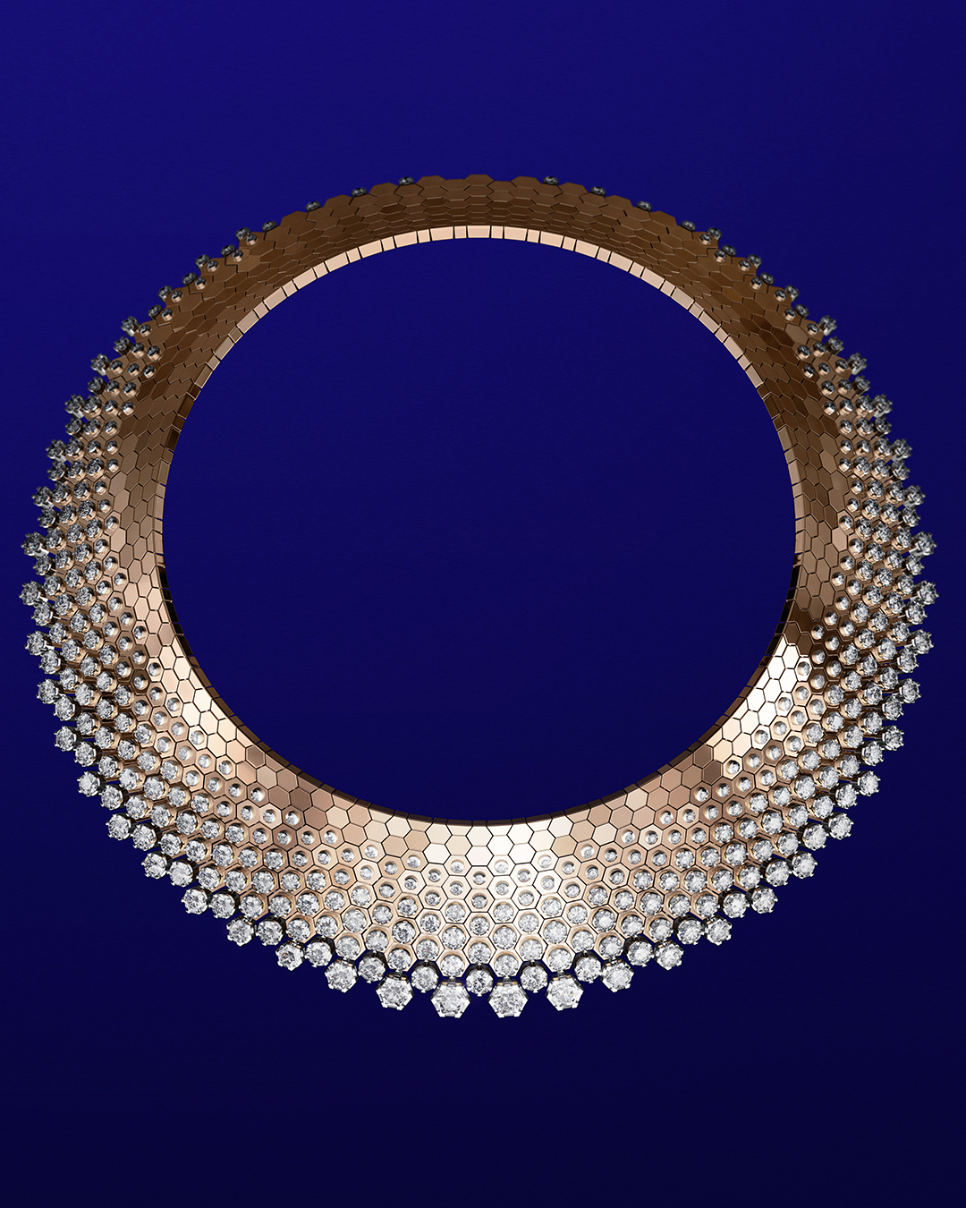 Chaumet Bee My Love系列新成員BIB項鏈由410克黃金,經手工雕刻、組裝和拋光而成,用上750小時精心製作而成。695個精緻的黃金鏈節,與390顆漸變排列的明亮式切割鑽石以及10顆皇后式切割(Taille Impératrice)鑽石熠熠生輝,猶如蜂群在陽光下翱翔。