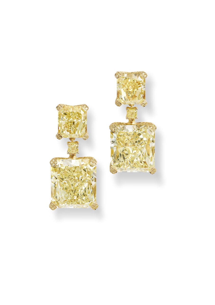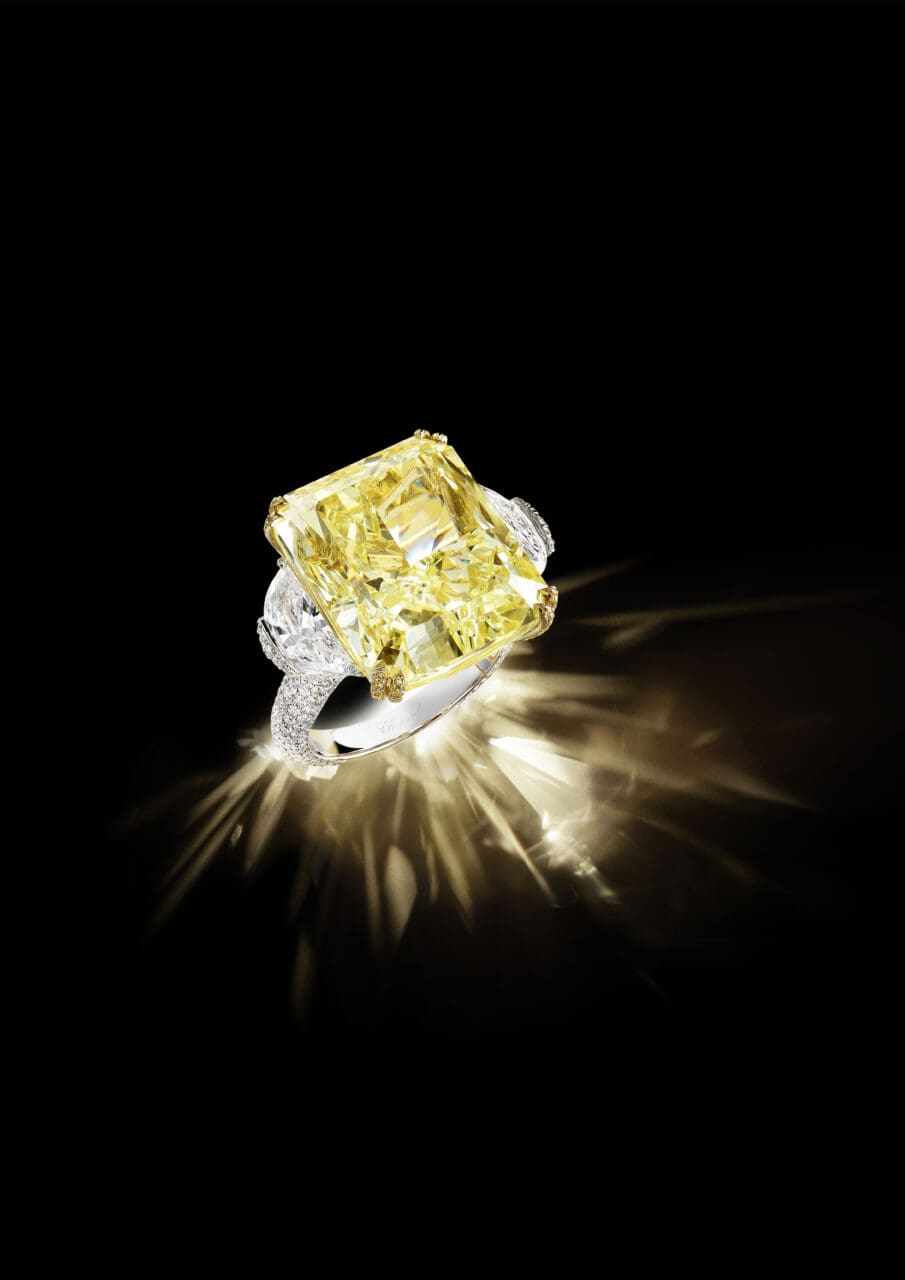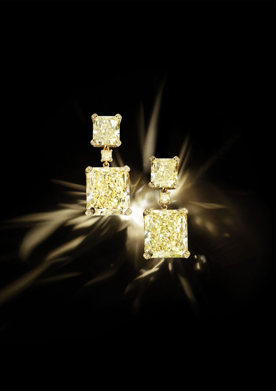 最吸引目光的必定是鑲嵌4顆總重達53.03卡巨大黃鑽的迷人耳環,品牌採用明亮式切割把黃鑽切割為具70個刻面的長方形造型,其獨特的光影折射效果提升了鑽石的光澤,展現出令人驚嘆的魅力。當中2顆大黃鑽連接部分飾以小黃鑽,則採用祖母綠和明亮式切割,同樣發揮了Chopard工坊大師的精湛工藝,也彰顯品牌在同色系彩鑽配搭上源源不絕的創意。
