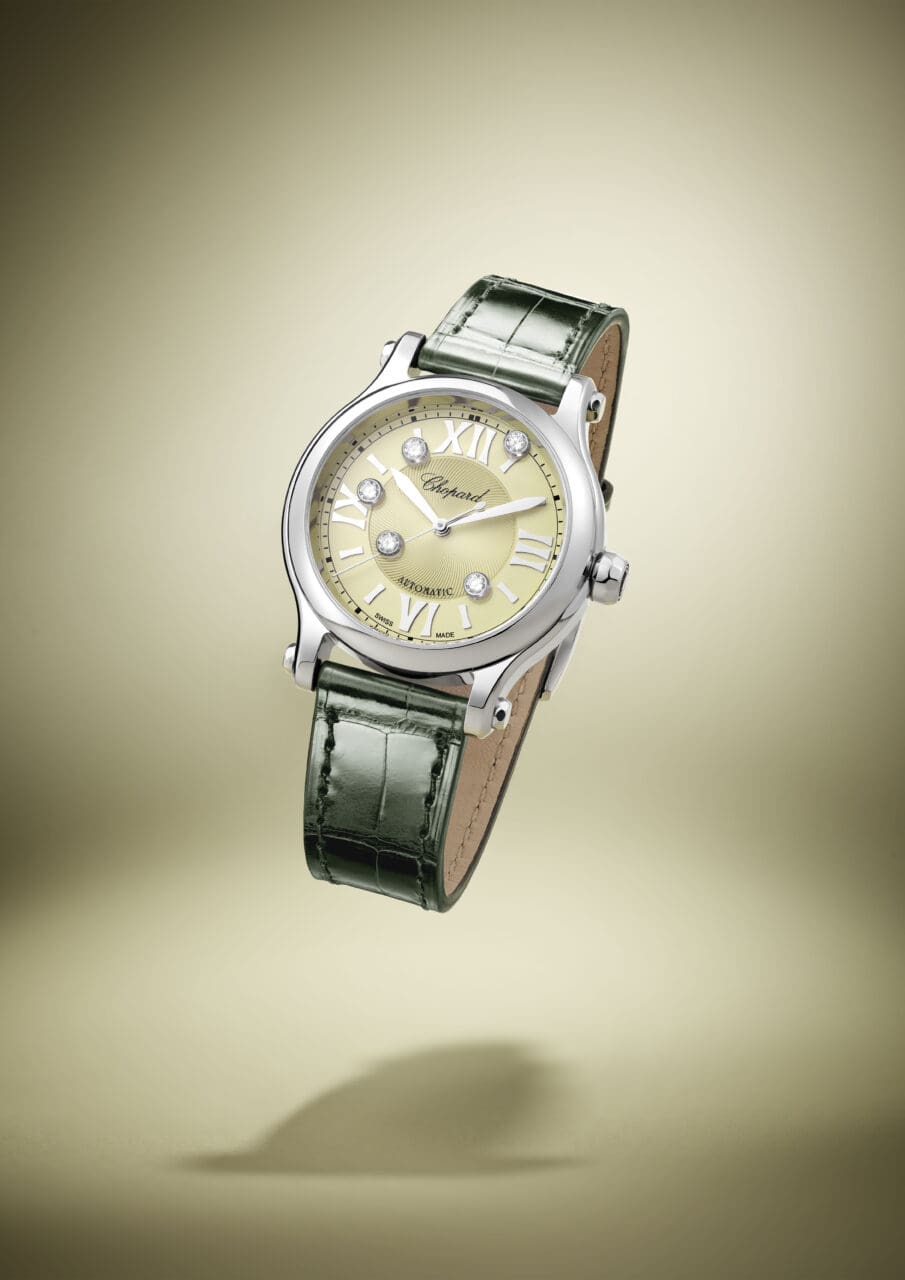 「自由自在的鑽石是最幸福快樂」的精神深深植根於Chopard的設計哲學,而表達對生命喜悅(Joie de Vivre)追求的Happy Sport系列腕錶則是為迎接豐盛生活的女性而設。全新推出的Happy Sport腕錶,採用大小適中的33毫米Lucent Steel™精鋼材質錶殼為創作畫布,這種合金材質由含量不低於80%循環再造的鋼材所製成,具有高光澤度和堅硬耐磨的特點,整體和諧圓融的造型符合「黃金比例」。飾有扭索刻紋的錶盤則是溫文爾雅的奶白色設計,而錶盤上5枚靈動流轉的鑽石,會隨佩戴者走動時盡情曼妙旋舞,完美體現品牌和現代女性敢於突破和追求自由的精神。