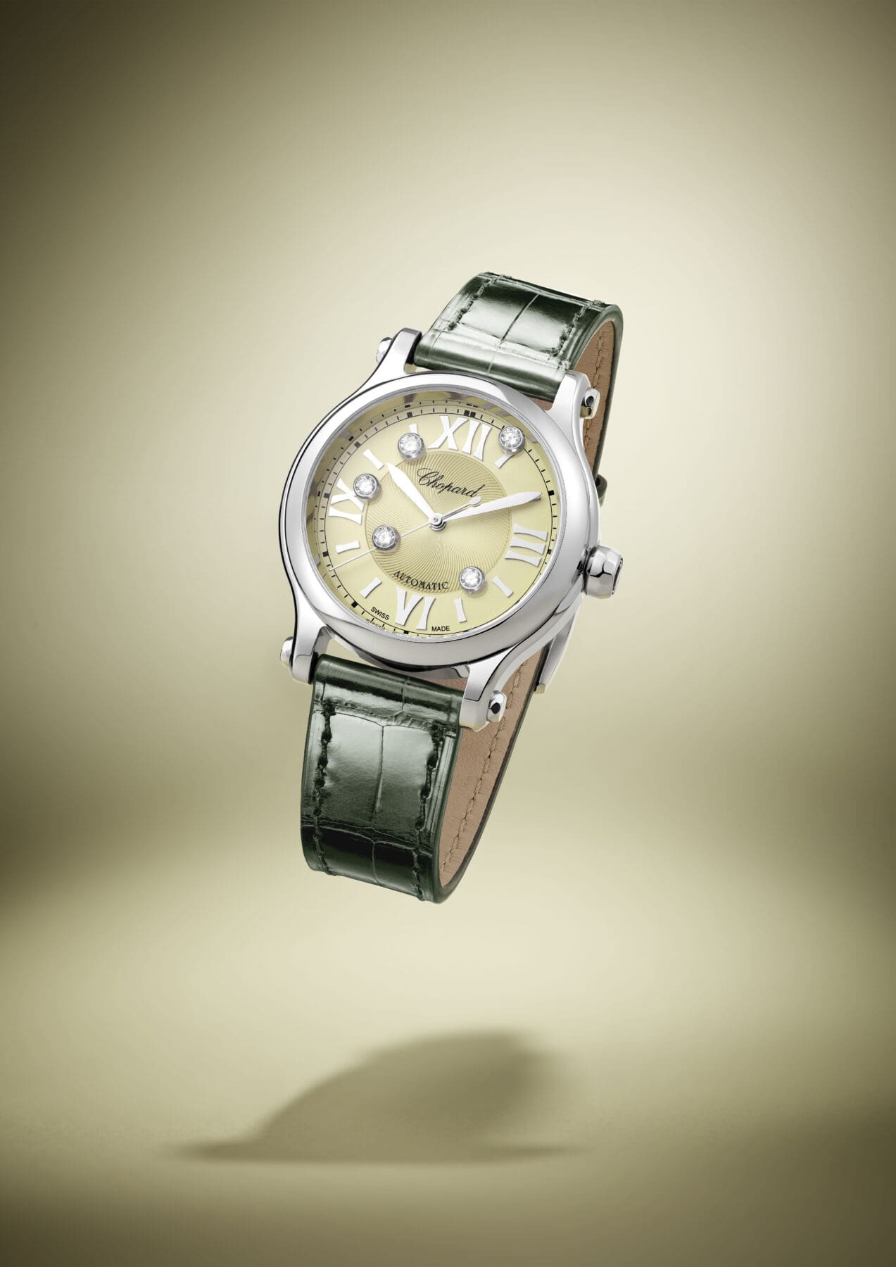 Happy Sport腕錶搭載由Chopard自主開發的09.01-C自動機芯,防水30米,動力儲存達42小時。錶冠上擁有鑲嵌橄欖綠碧璽的細節,與同色系的高級亮面鱷魚皮革錶帶互相搭配,在纖幼的女性手腕上顯得更加美輪美奐。