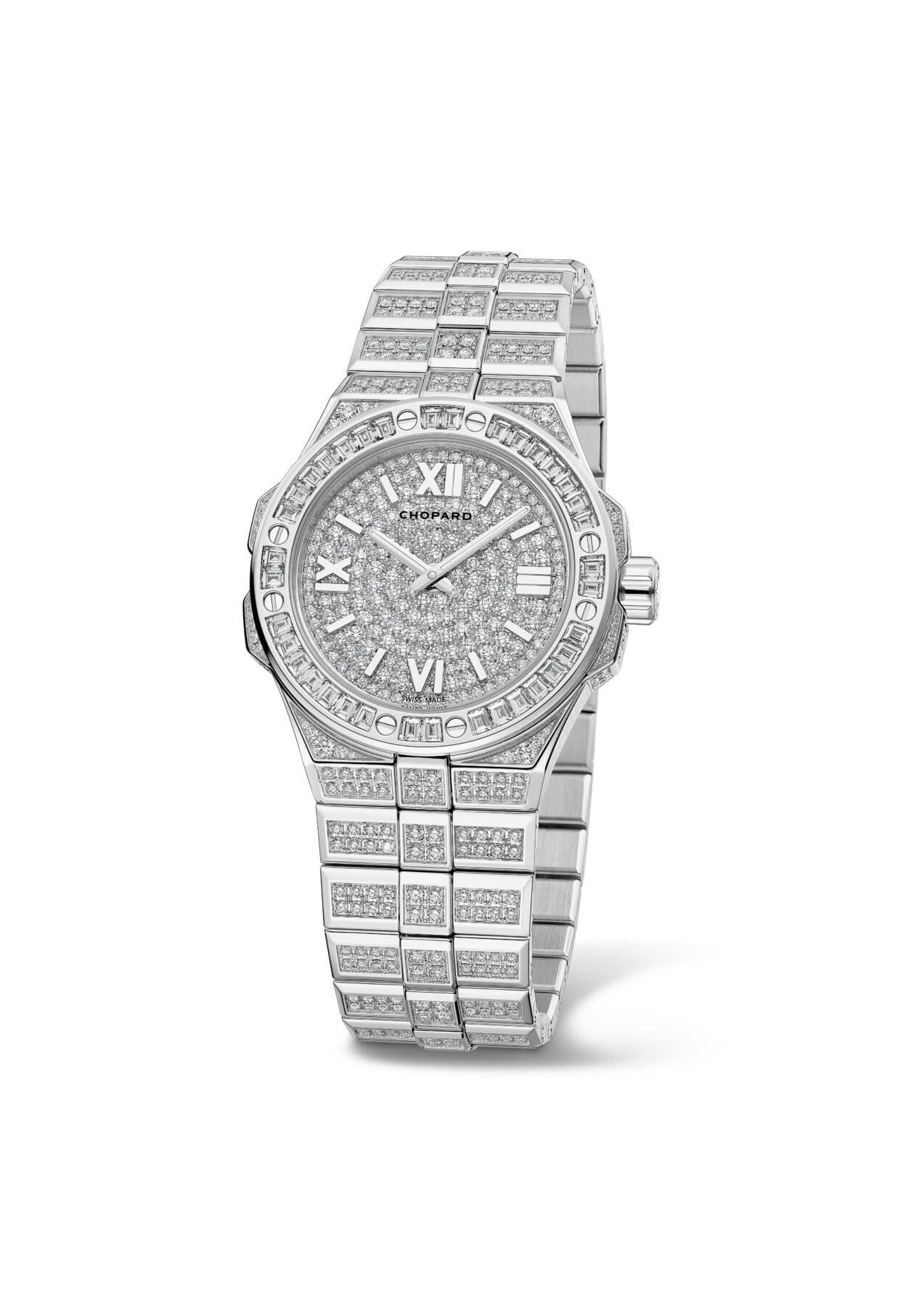 Chopard洋溢現代時尚特色的Alpine Eagle Frozen腕錶今年增添全新33毫米錶殼演繹,在保持原有36毫米和41毫米版本的和諧比例下,同樣由浩瀚的大自然中汲取靈感。工匠以相傳的高超技藝把數百顆鑽石密鑲於錶殼、錶盤、錶盤、錶冠和錶帶鏈節上,閃耀出如同冰川寒光潾潾的光芒。錶盤設計返璞歸真,沒有複雜的小錶盤或日期顯示功能,是簡單的兩針設定,鍍銠鑲貼時標和羅馬數字清晰易讀,錶冠鐫刻羅盤玟瑰,錶框則飾以拋光倒角,每個細節也表現了品牌的高貴優雅風範。