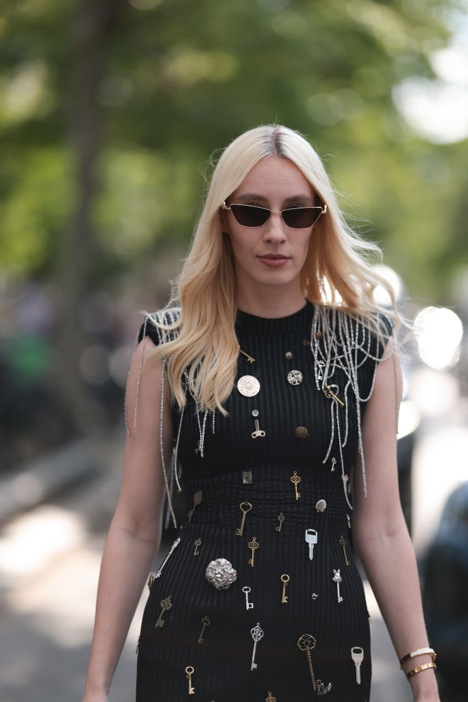PARIS, FRANCE - JUNE 25: Magda Swider seen wearing Valentino gold sunglasses, Homolog black cotton long dress with gold key details, Hermès white / gold clic bracelet, Cartier gold bracelet, before Giorgio Armani Prive, during the Haute Couture Fall/Winter 2024/2025 as part of Paris Fashion Week on June 25, 2024 in Paris, France. (Photo by Jeremy Moeller/Getty Images)