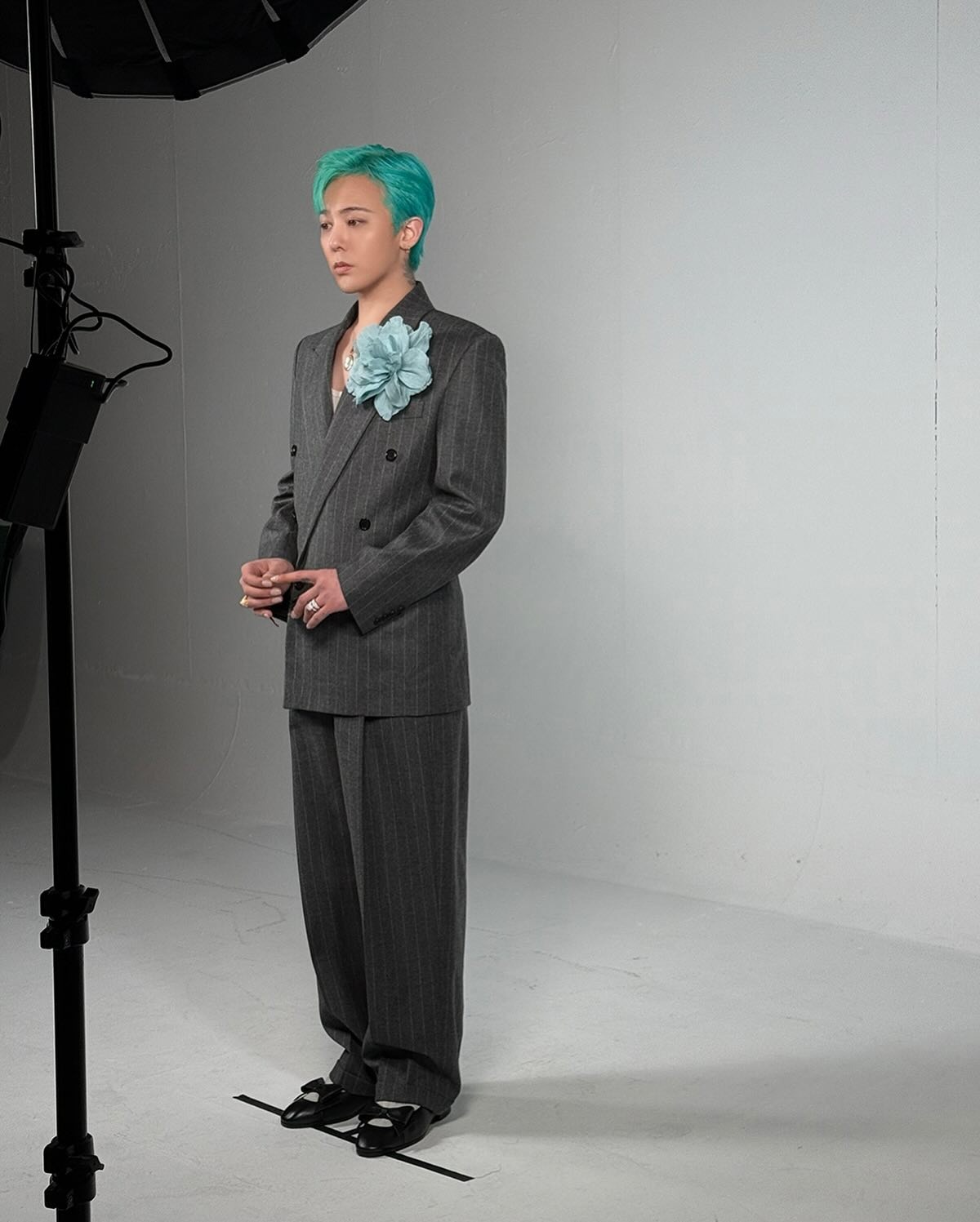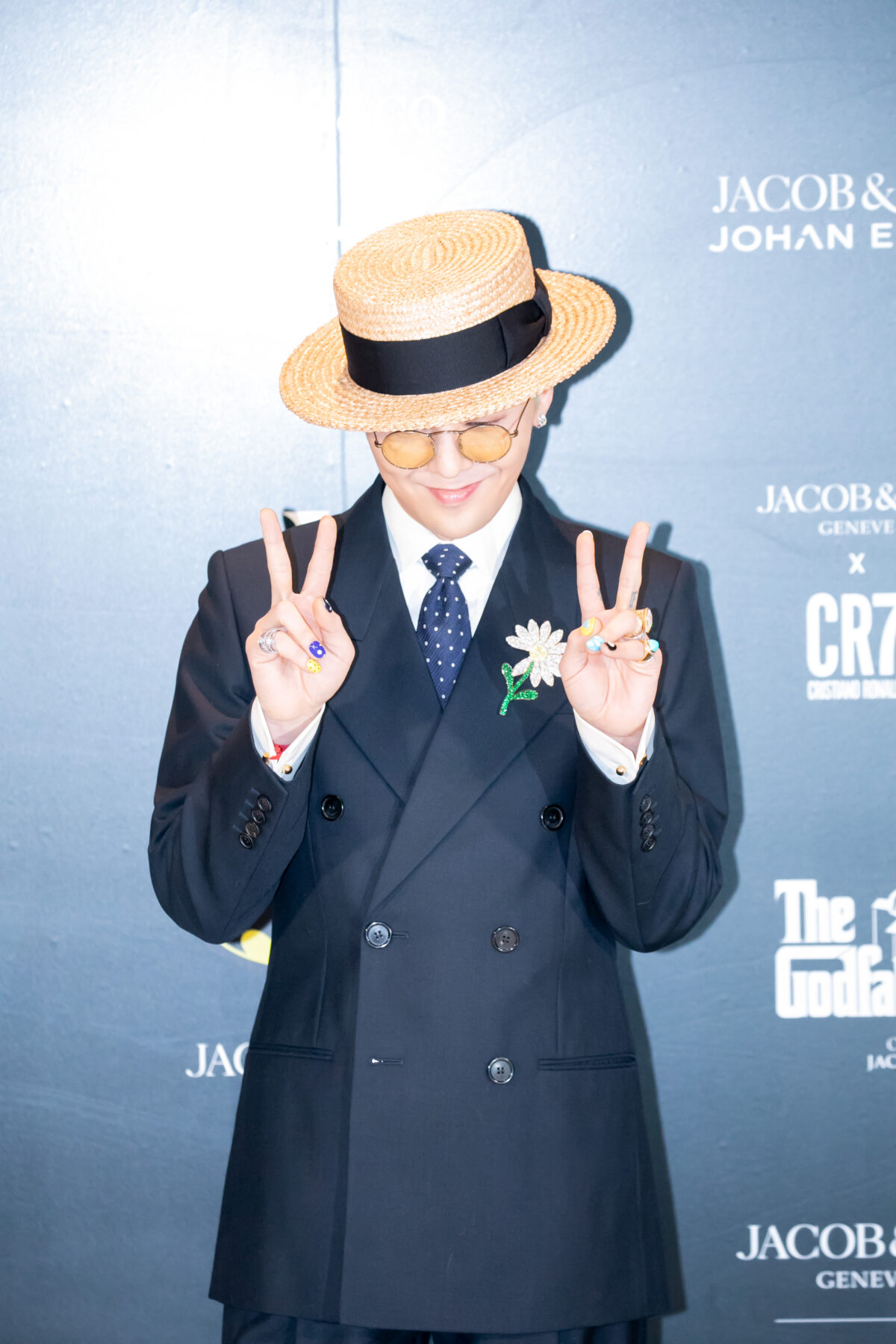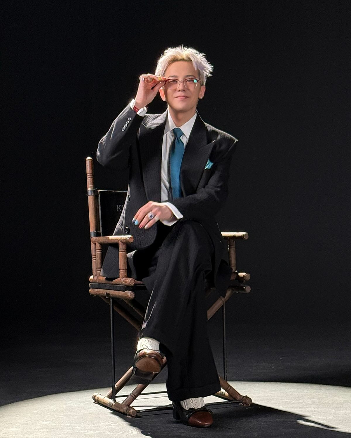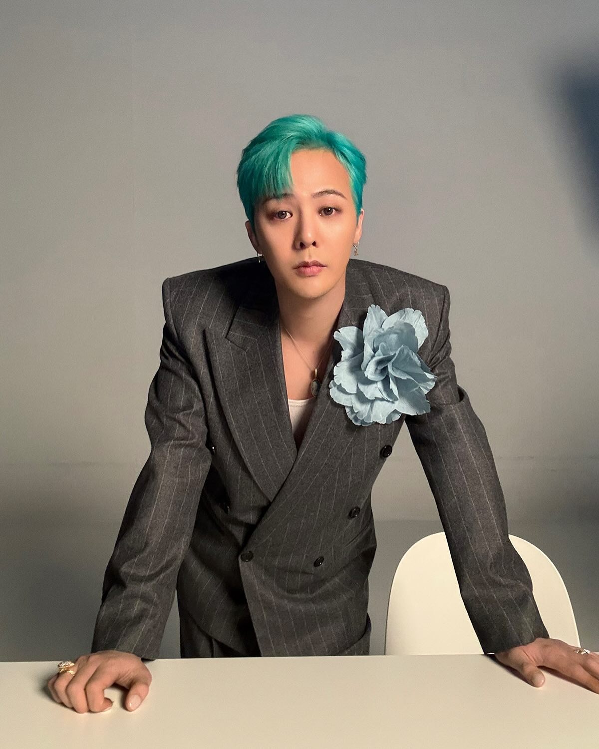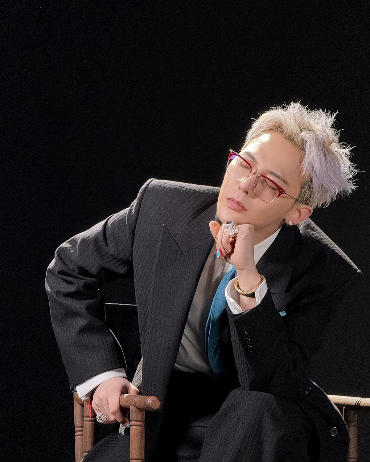 在出席個人綜藝《Good Day》記者會時,G-Dragon 以格紋西裝與牛仔褲造型搭配 Nudo Sky Blue Topaz Maxi Ring,15 卡主石與薄荷綠髮色呼應,營造整體清新調性。戒身為白金材質,鑲有 58 顆白鑽,於手部轉動時流轉冷調光芒,展現冷靜又鮮明的風格意象。