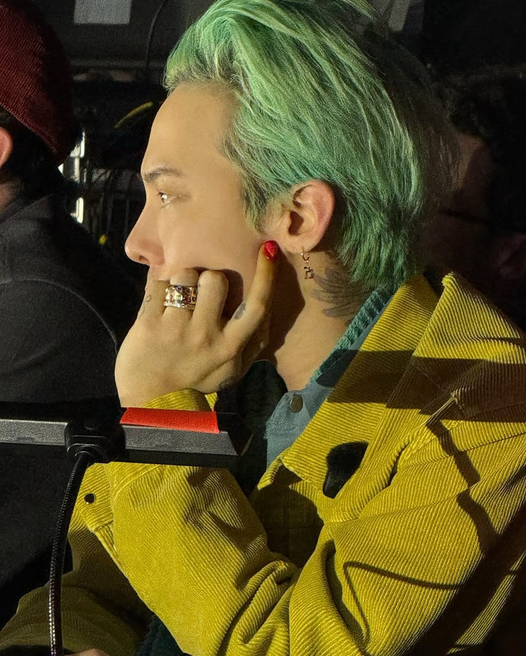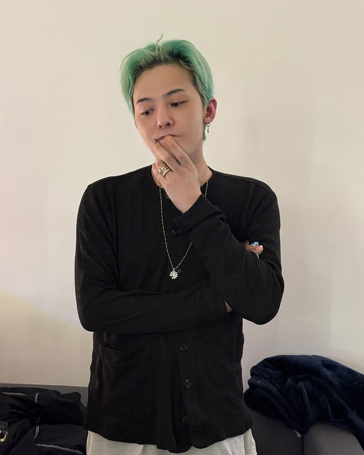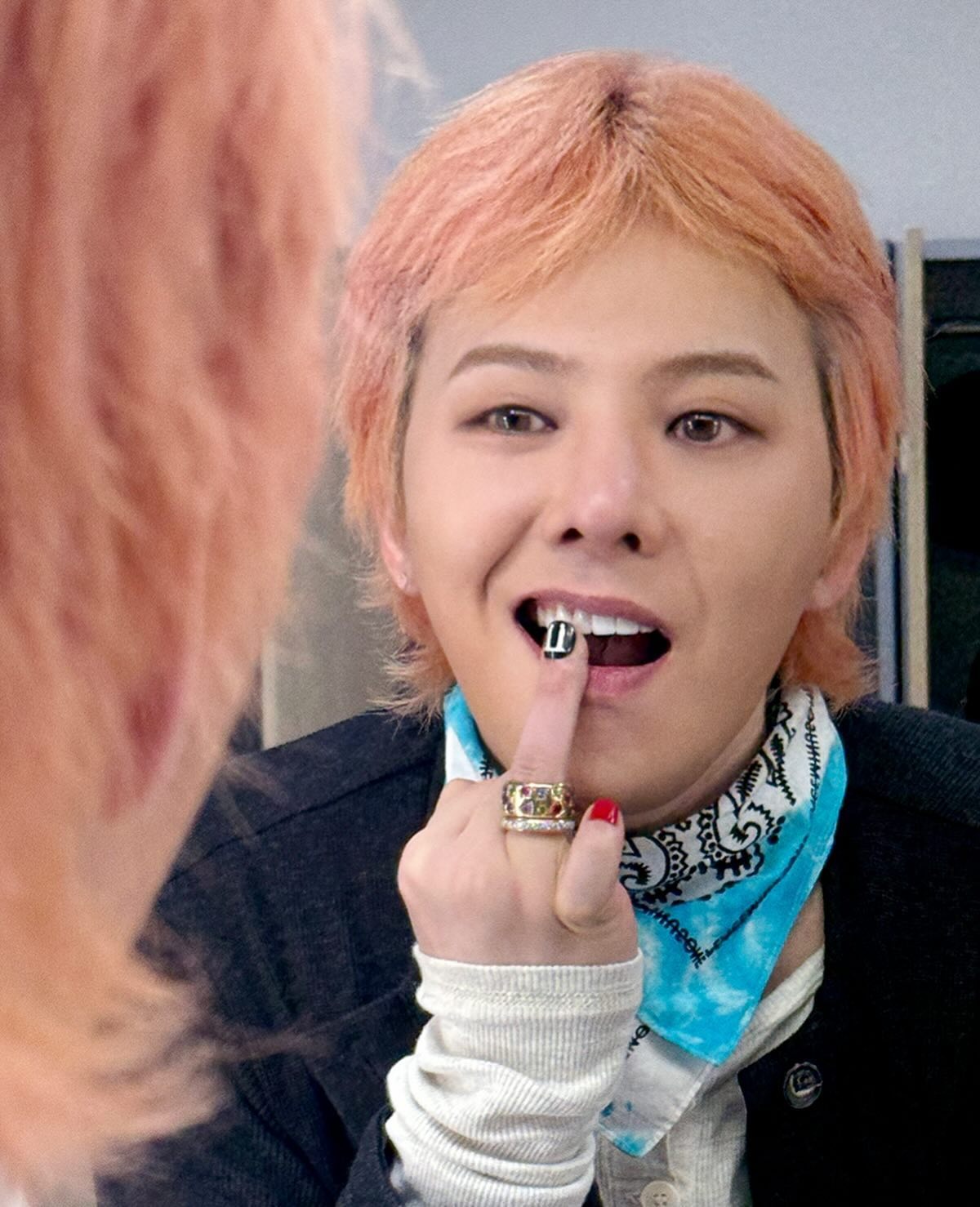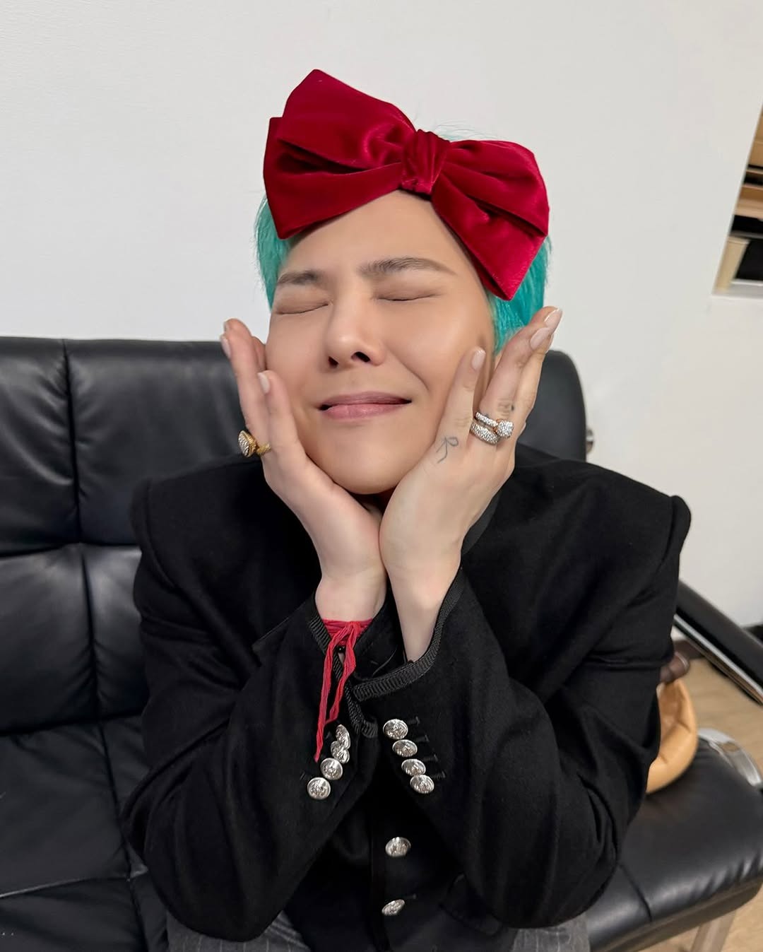 在出席個人綜藝《Good Day》記者會時,G-Dragon 以格紋西裝與牛仔褲造型搭配 Nudo Sky Blue Topaz Maxi Ring,15 卡主石與薄荷綠髮色呼應,營造整體清新調性。戒身為白金材質,鑲有 58 顆白鑽,於手部轉動時流轉冷調光芒,展現冷靜又鮮明的風格意象。