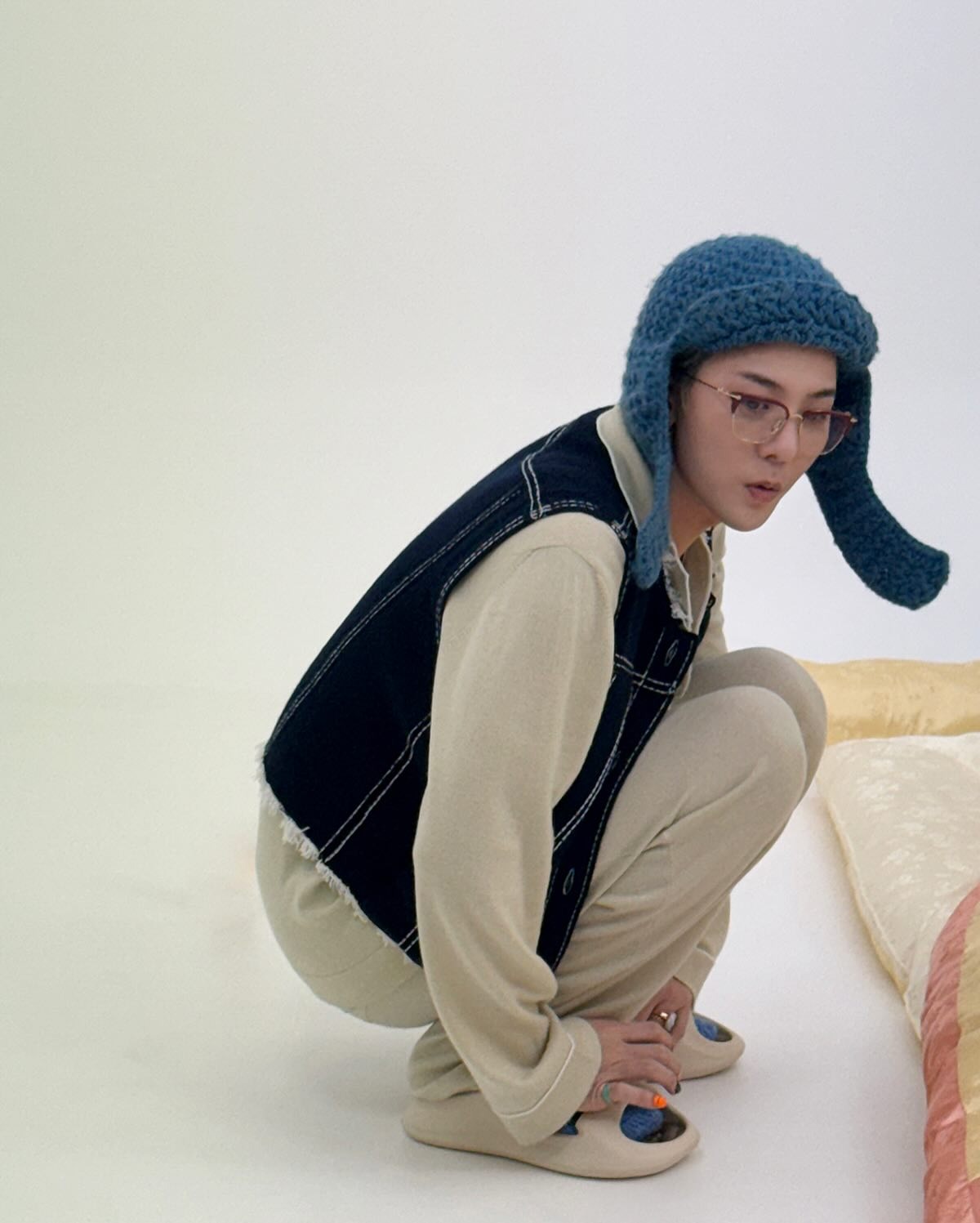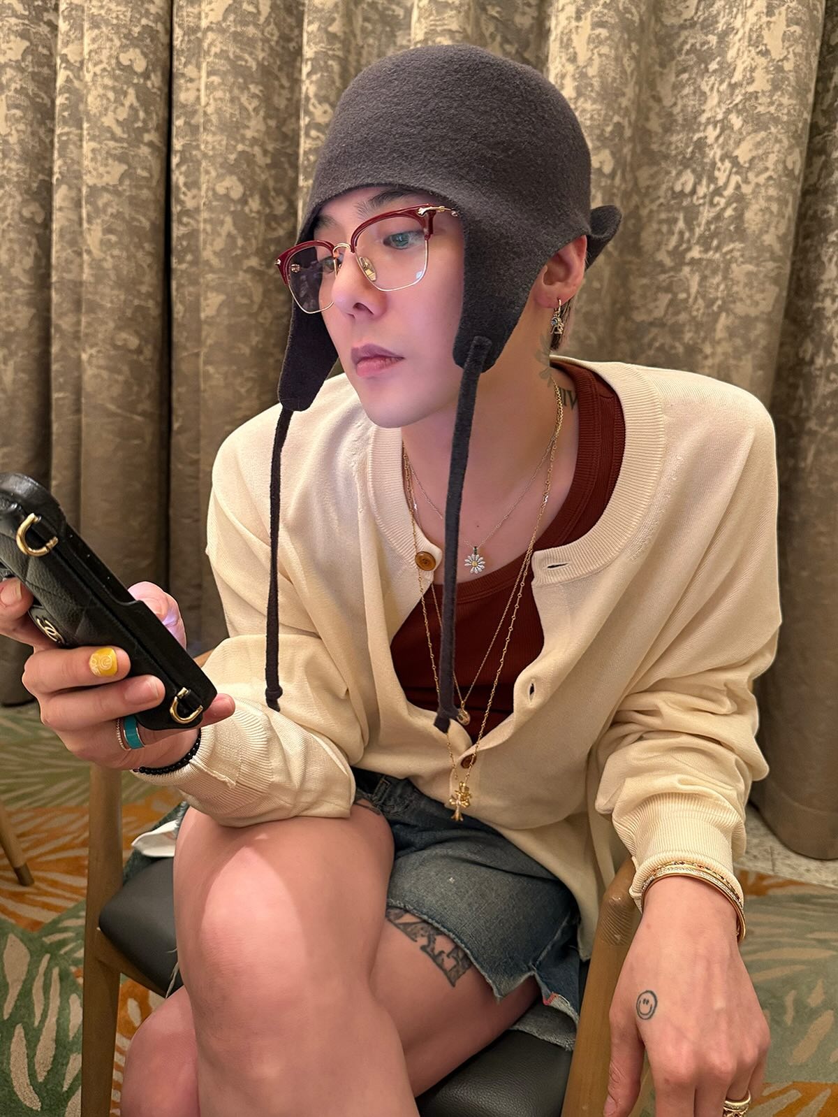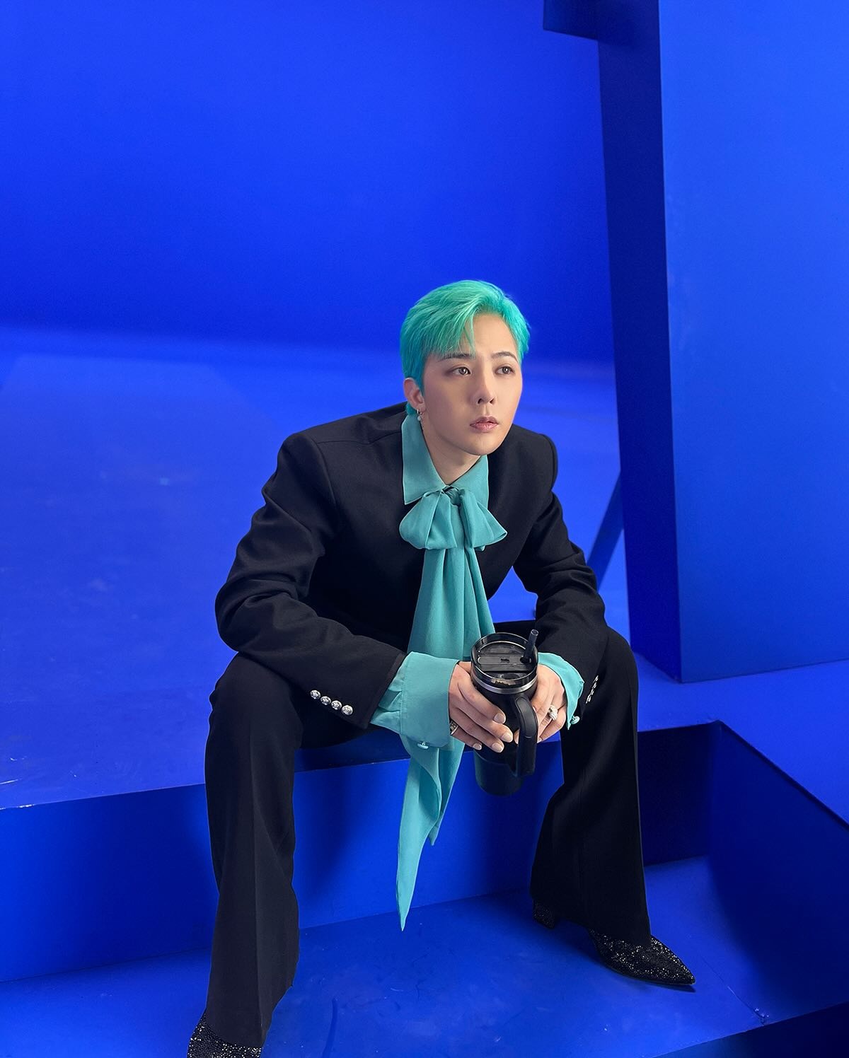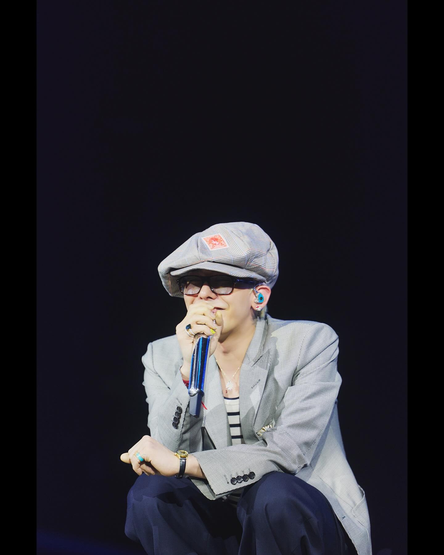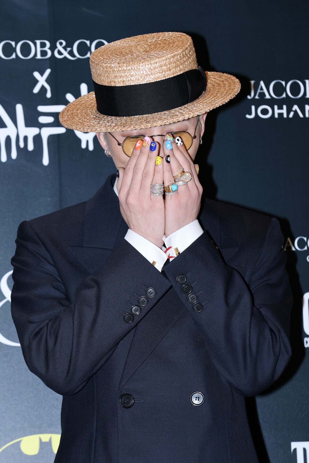 在出席個人綜藝《Good Day》記者會時,G-Dragon 以格紋西裝與牛仔褲造型搭配 Nudo Sky Blue Topaz Maxi Ring,15 卡主石與薄荷綠髮色呼應,營造整體清新調性。戒身為白金材質,鑲有 58 顆白鑽,於手部轉動時流轉冷調光芒,展現冷靜又鮮明的風格意象。