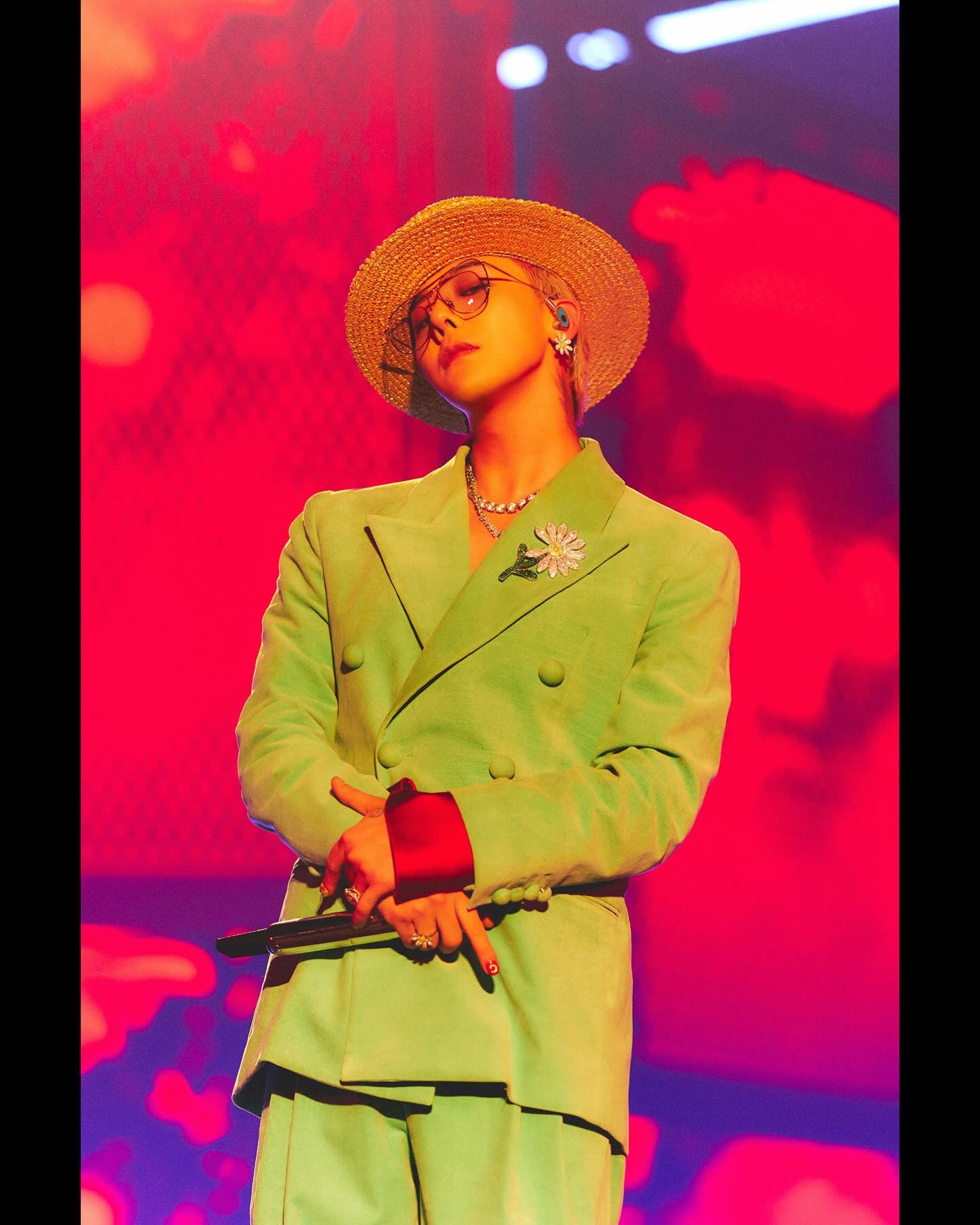 延續 “Free Gems” 的創作理念,Pomellato Nudo 高級珠寶系列紅碧璽戒指以濃郁的樹莓紅色碧璽為主石,禮讚珍稀原石的自然之美。寶石精選自品質卓越且個性鮮明的珍稀原料,以弧形玫瑰金包覆,突顯 Nudo 系列標誌性的切割工藝。戒指鑲嵌的白鑽鋪鑽更為其增添璀璨光彩,於豐盈立體與極簡設計之間,營造出細膩而洗練的平衡,展現 Pomellato 一貫的高雅氣質。在舞台上,G-Dragon 更偏愛選擇大體積的戒指,展現他鮮明的個人風格。無論是沉穩的格紋西裝,還是充滿個性的藍綠色雙排扣西裝,Pomellato Nudo 紅碧璽戒指都游刃有餘地提升整體造型的層次感與奢華感。