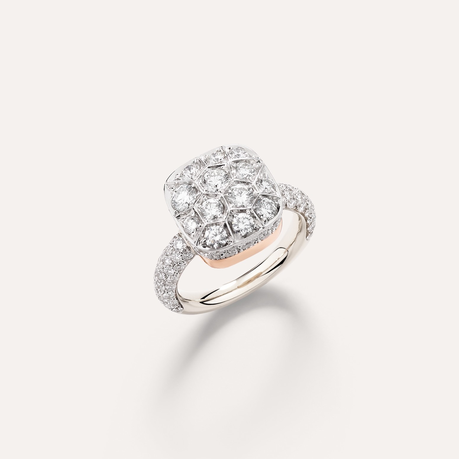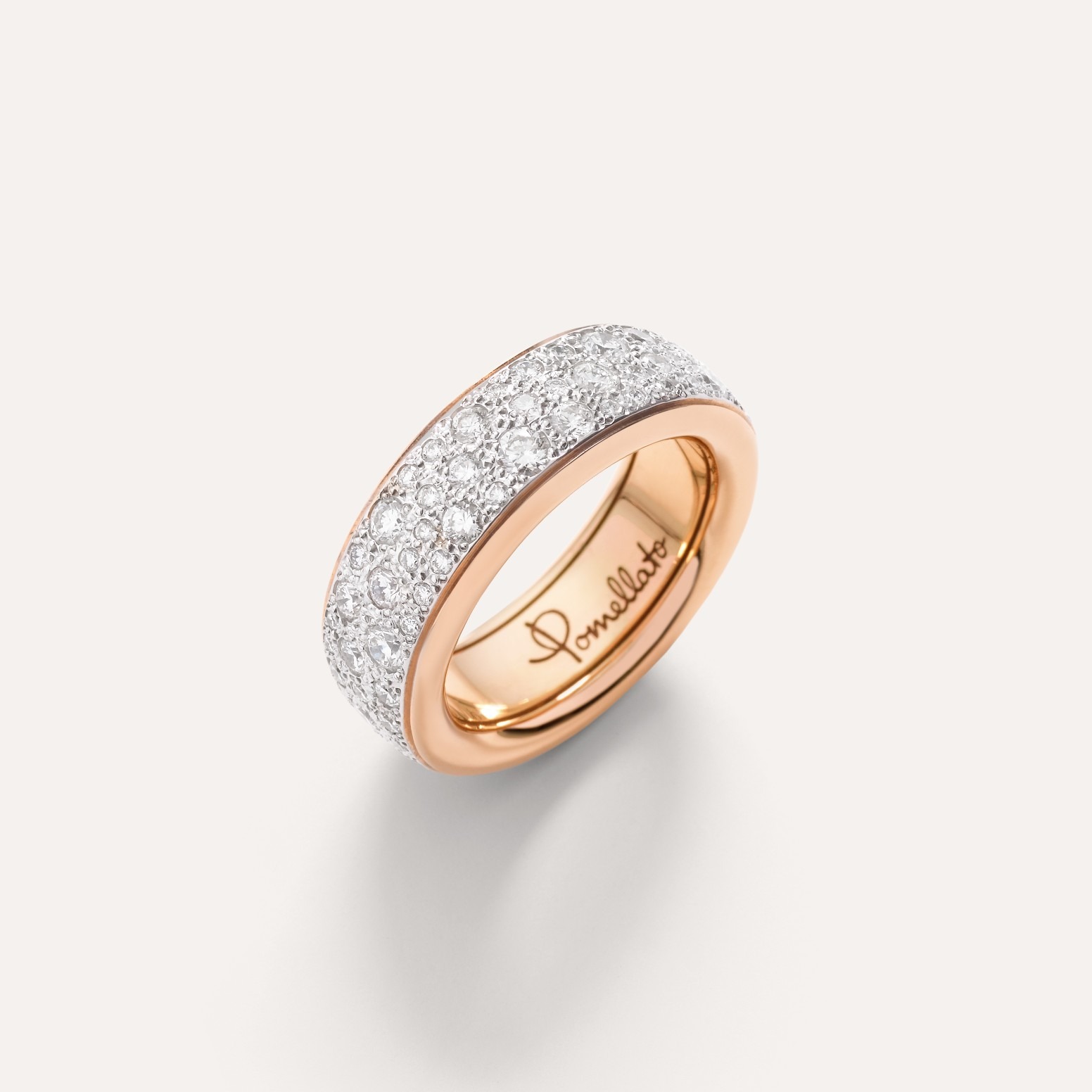 Iconica Slim Ring 則為設計上更具份量的一款,選用 97 顆白鑽密鑲於寬版玫瑰金戒臂中,整體呈現厚實立體的輪廓感。這款戒指強調雕塑感的線條與對稱結構,不論是單獨佩戴還是與其他戒指疊戴,都展現 Pomellato 所推崇的力量感與現代美學。戒身的內側拋光處理亦十分講究,確保佩戴時舒適貼合,突顯品牌對細節的極致追求。