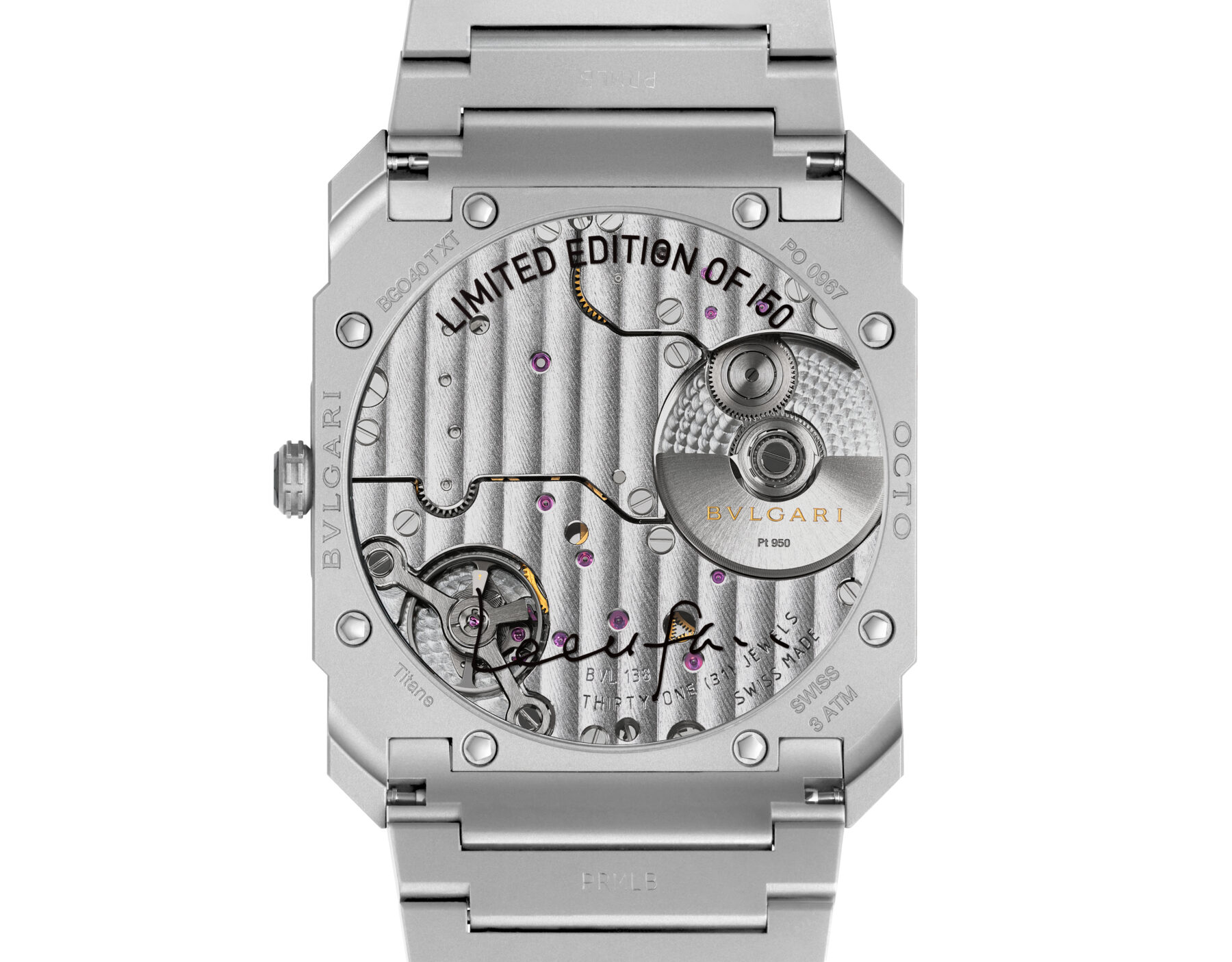 40毫米的鈦金屬錶殼與錶鏈均以人手處理和打磨,呈理像岩石質感的特別紋理且獨一無二。至於錶盤剛利用鏡面設計創造出深邃的空間感,搭配僅厚2.23毫米的BVL 138自動上鏈機芯,讓錶殼整體厚度維持在5.5毫米,透明底蓋更鐫刻上李禹煥親筆簽名,限量150枚。