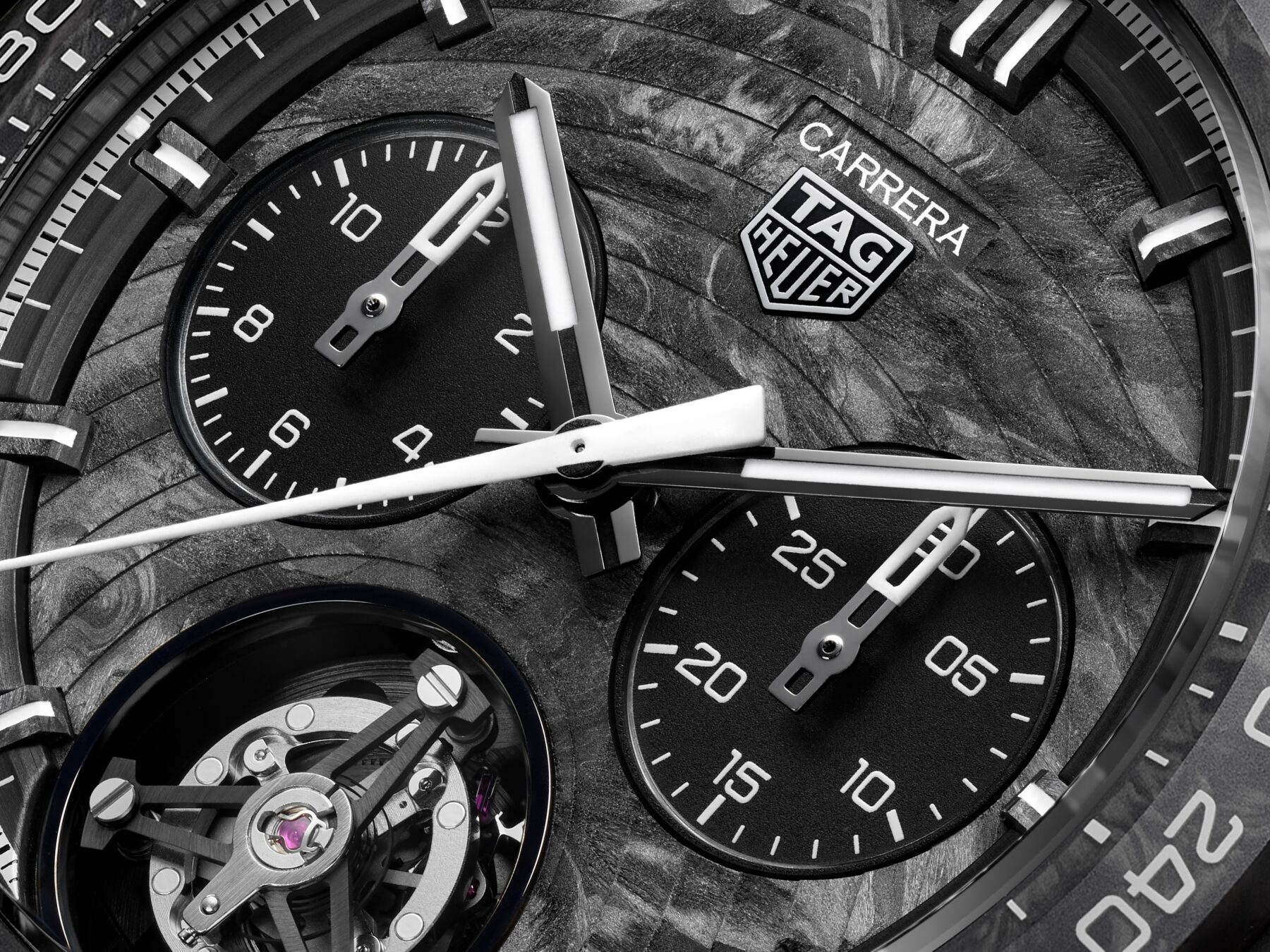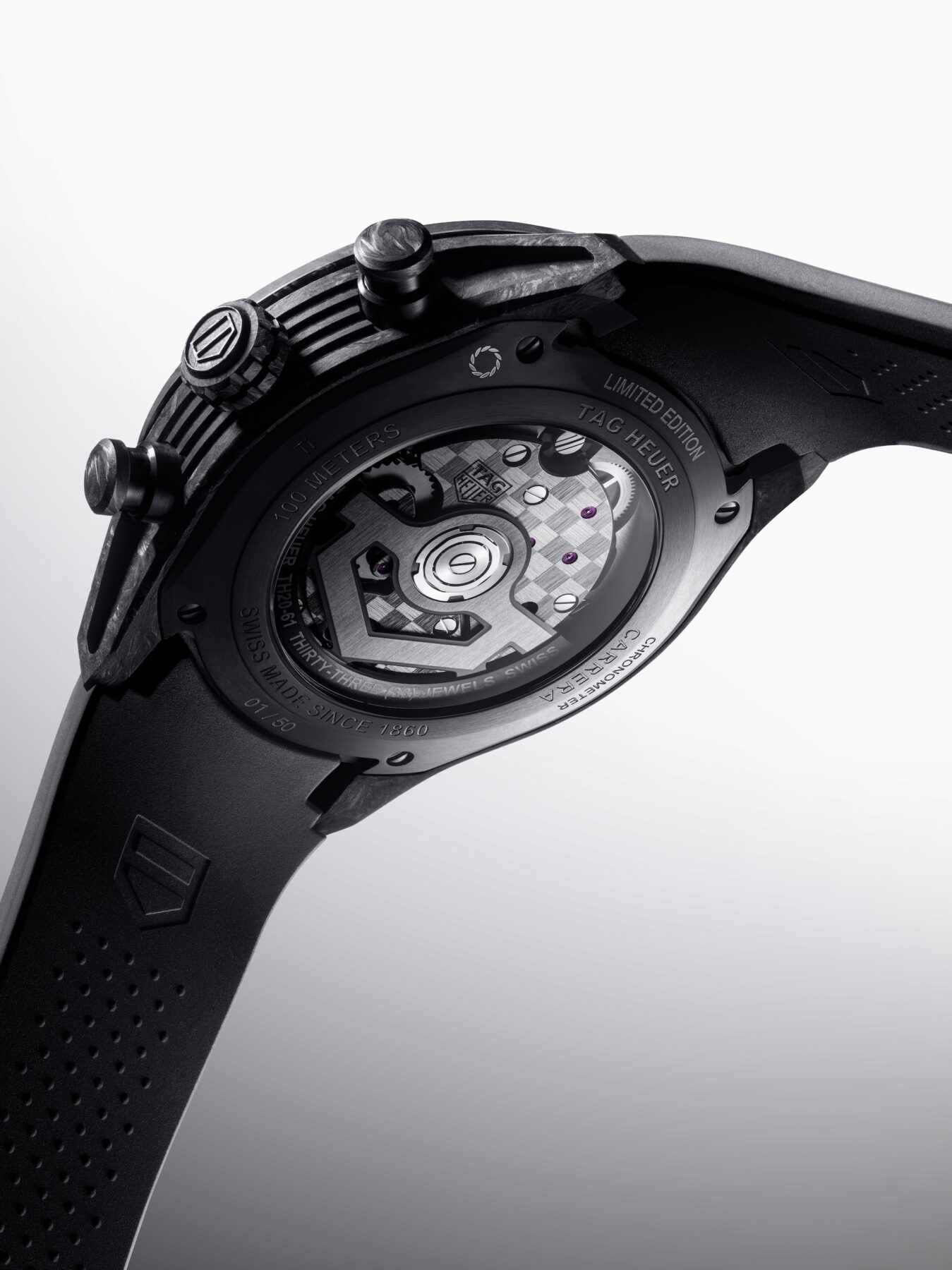 Monaco Flyback Chronograph TH-Carbonspring腕錶採用39毫米方形碳殼,配備 COSC 認證的 TH20-60 自動飛返計時機芯,具備80小時的動力儲備;Carrera Chronograph Tourbillon Extreme Sport TH-Carbonspring腕錶則以44毫米的碳表錶殼示人,並配以碳纖測速圈與黑色橡膠表錶帶,搭載動力儲備達65小時的TH20-61自動機芯,各限量50枚。