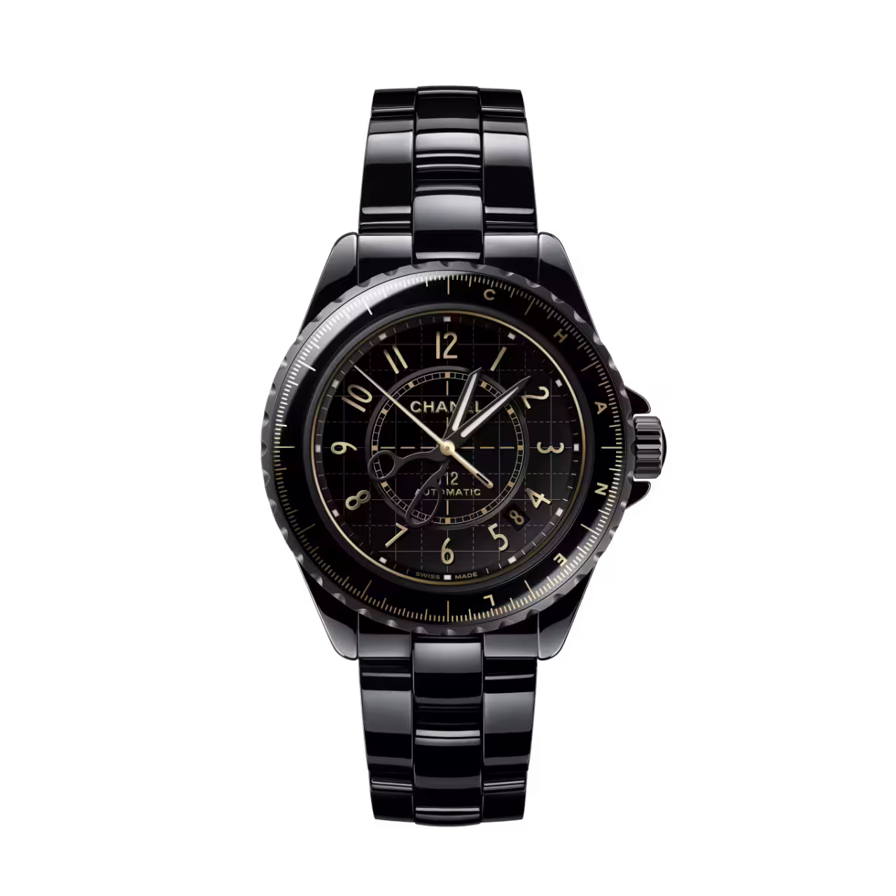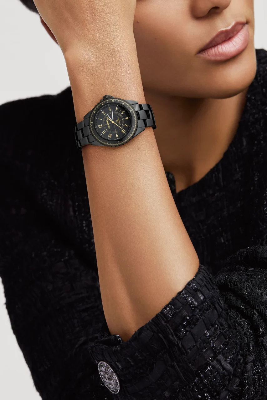 Chanel於2000年推出的J12腕錶,靈感來自賽車及美洲盃帆船的優雅設計,採用高科技陶瓷作為主要材質,具有輕巧耐用及防刮花特性。為了實現抗磨損高於精鋼7倍的陶瓷,品牌不斷研發技術,利用優質粉狀礦物,將其標誌性的深淵黑色演繹得淋漓盡致。像是高級腕錶系列的J12 Couture腕錶,便以黑色點綴金色細節。金色縫紉針和裁縫剪刀造型的指針置在黑色漆面錶盤之上,清晰地顯示着時間。黑色陶瓷與啞面鍍黑精鋼融為一體製成錶殼,透過多種不一樣的黑彰顯腕錶的豐富層次。
