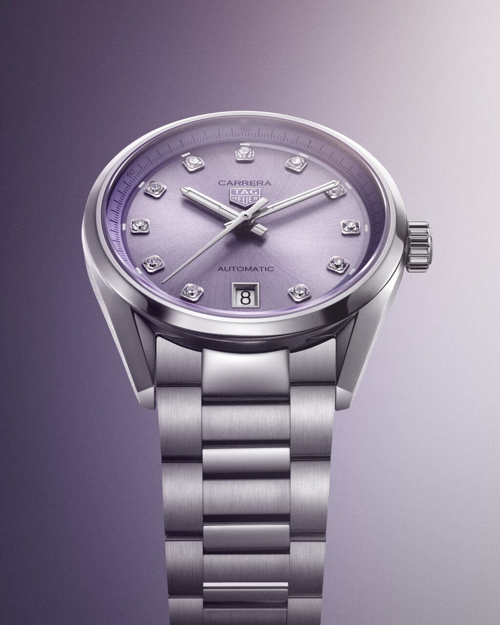 Carrera Date腕錶在LVMH Watch Week 2025披上柔美的粉色調,採用精鋼材質製作36毫米的錶殼,厚度僅10.26毫米,經過精細拋光處理,能完美貼合手腕。淡粉紅色款配備太陽紋磨砂錶盤,而淡紫色款則採用蝸紋磨砂錶盤,錶盤的時標皆鑲嵌鑽石,散發女性優雅的溫柔氣質。
