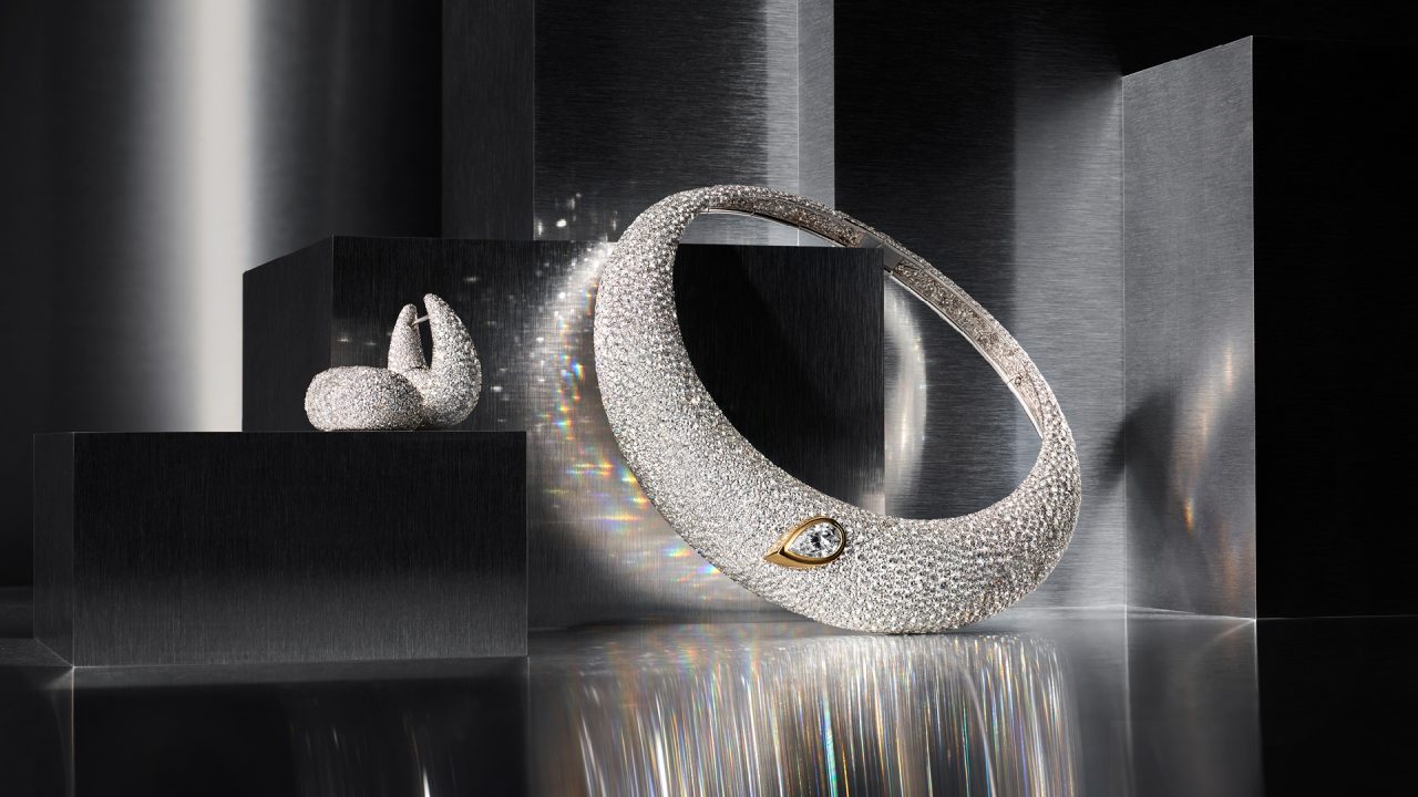 此次推出的「White Midnight Sun」系列憑藉精湛的鑲嵌工藝和大膽設計,展現出 Messika 品牌在高級珠寶界的超群地位。其中最矚目的,就是一條鑲嵌超過2,400顆雪花形切割鑽石的項鏈,飾在中史位置的梨形主鑽散發溫潤的光,宛如一輪高掛在夜空中的明月。別具創意的立體耳夾,更為這套華美的珠寶套裝增添了摩登時尚的韻味。