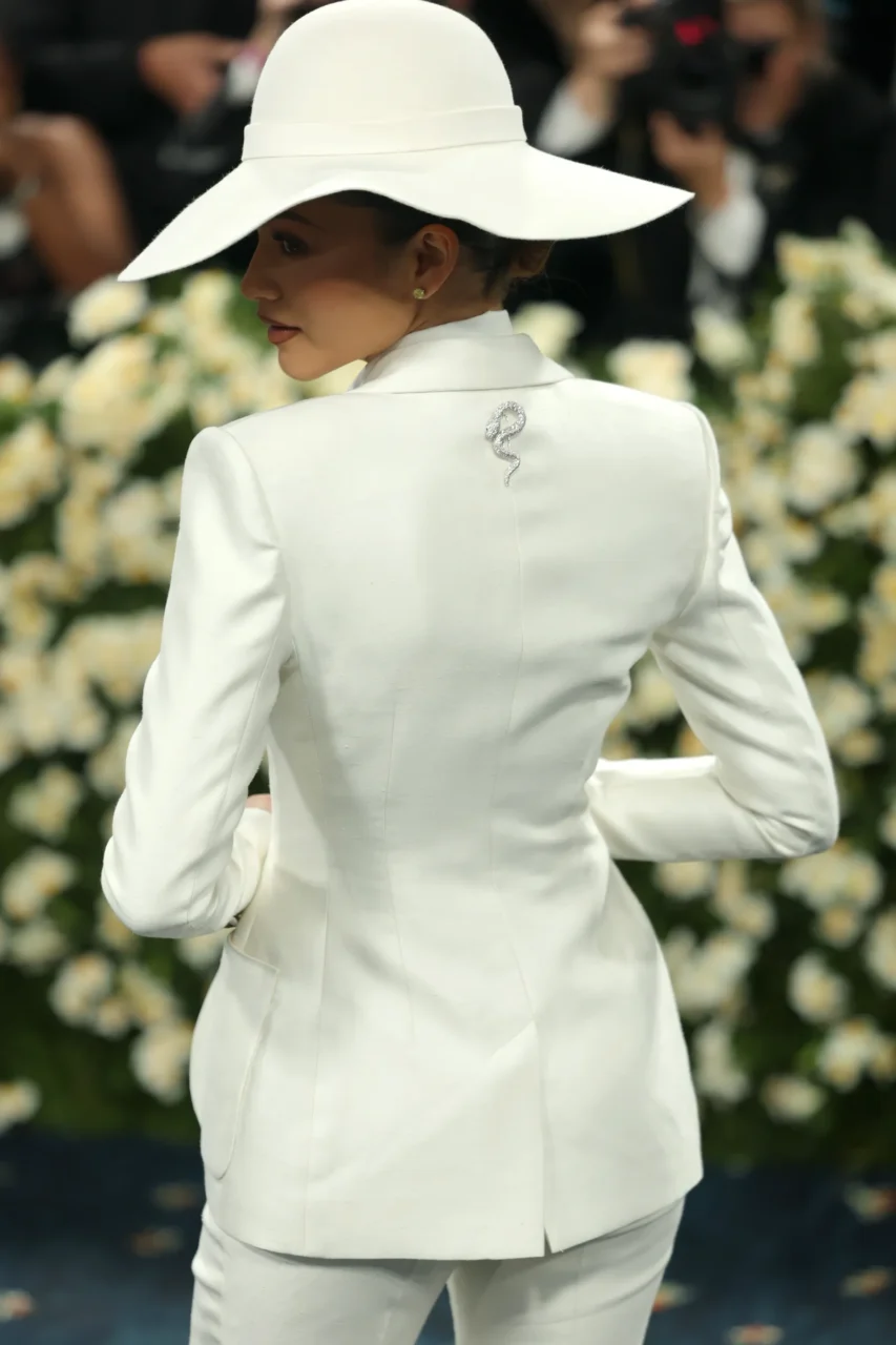 Zendaya戴上BVLGARI珠寶首飾,配搭全白色的Louis Vuitton 西裝套裝和白色闊邊帽亮相紅地毯,俐落造型盡顯她的型格面向。