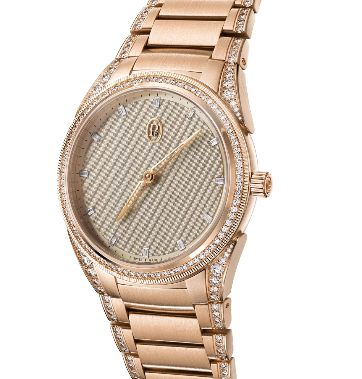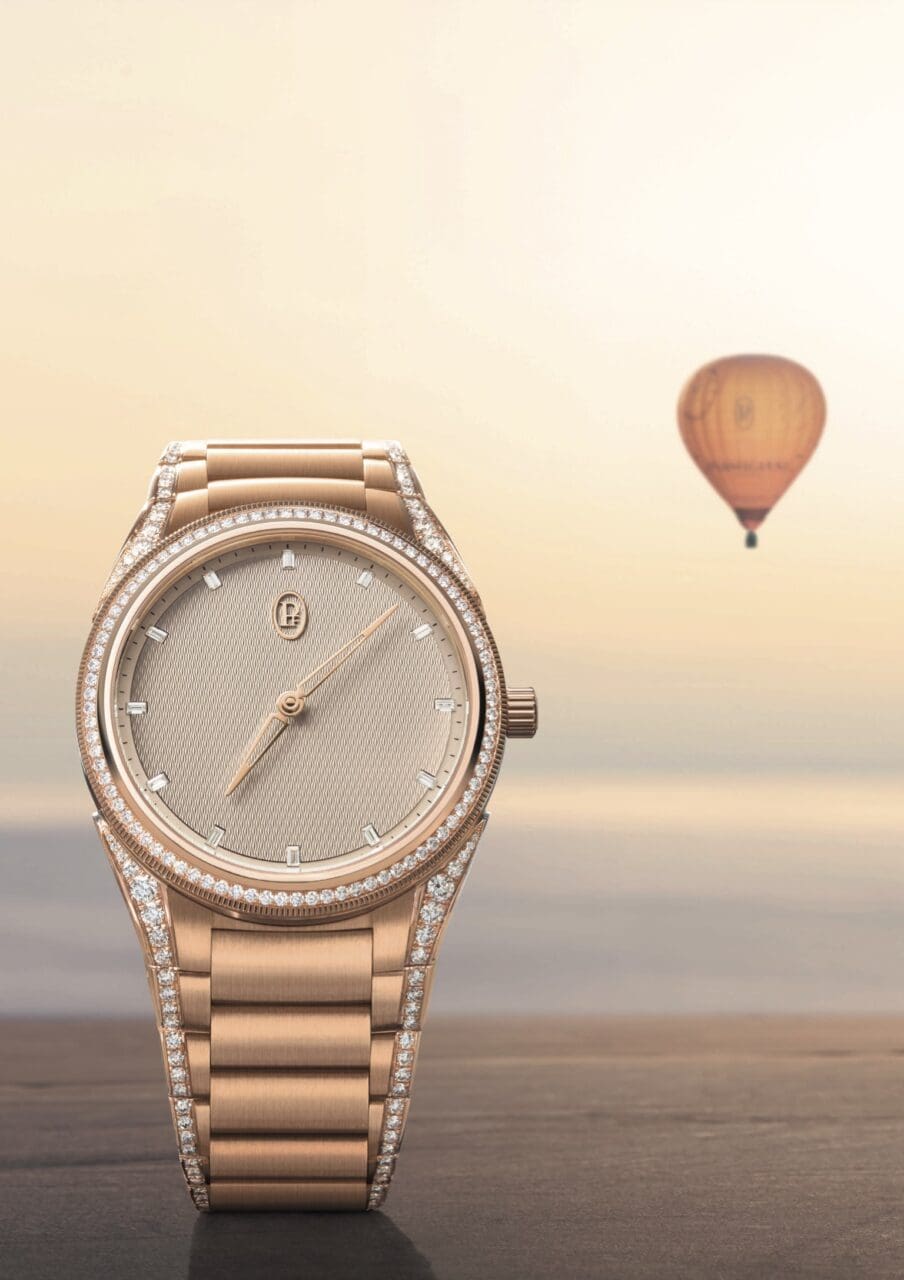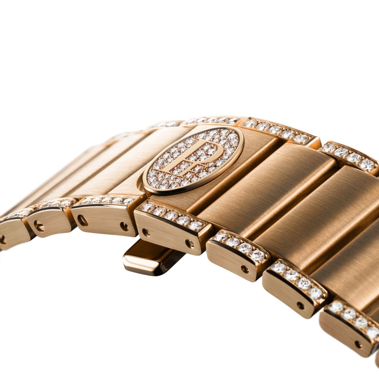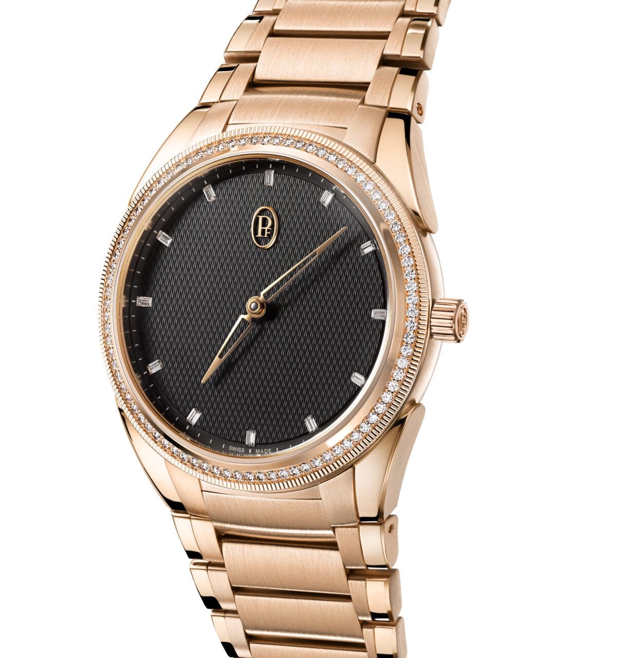 新推出的Tonda PF Automatic 36mm腕錶中,兩款玫瑰金版本的設計令人驚艷,從錶殼到錶圈,再到錶帶皆採用18K玫瑰金材質,並搭配砂金或暖灰兩種色調的錶盤。錶盤鐫刻上精緻的「格狀大麥粒」璣鏤飾紋,12時位置置有代表品牌PF的標誌,立體的長形切割鑽石時標閃耀璀璨光芒,與錶圈上的明亮切割鑽石互相輝映,而2枚三角形通心指針也為整體設計增添活力。