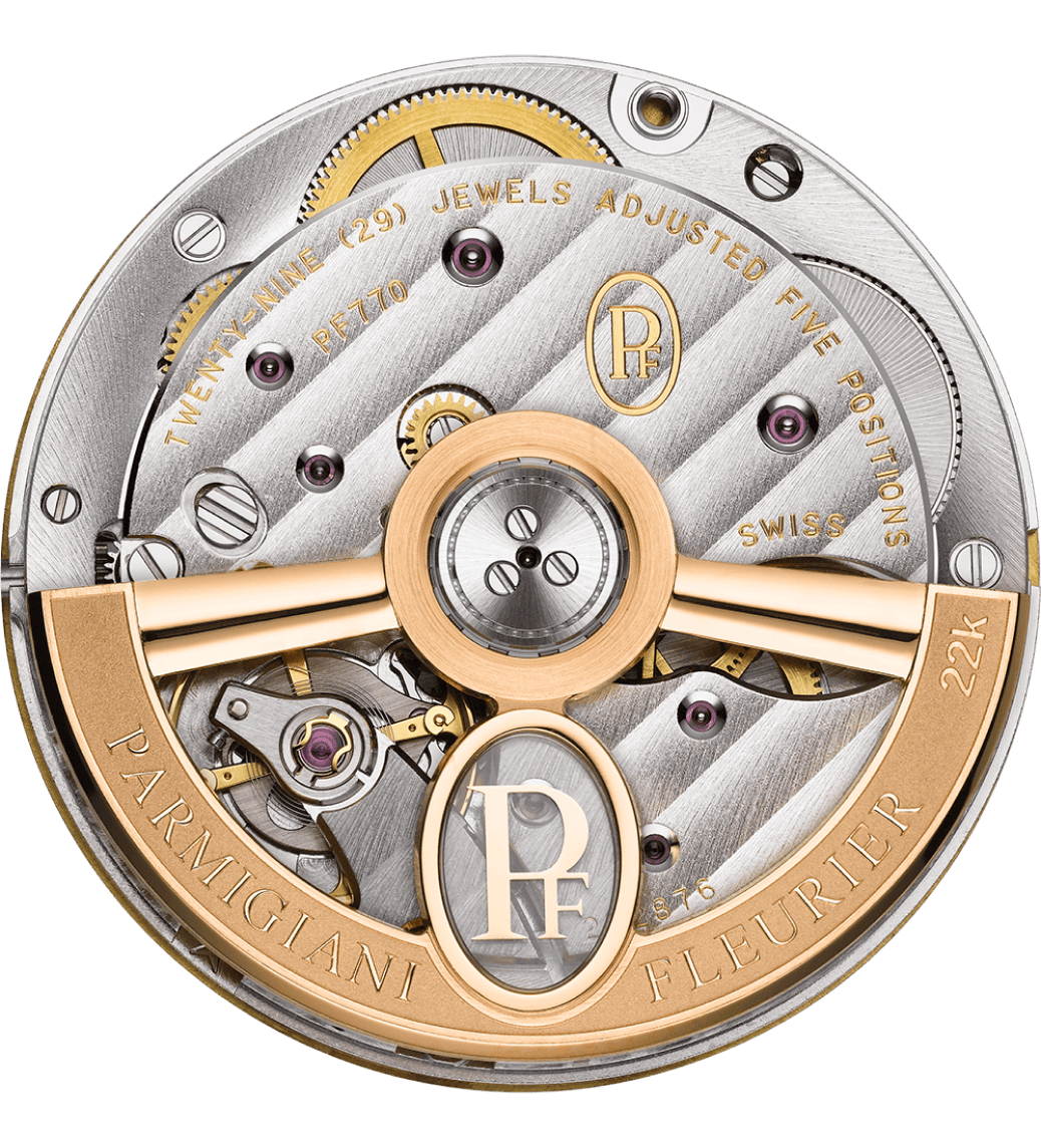 從透明的藍寶石玻璃底蓋可直接欣賞PF770機芯上的精緻刻紋。