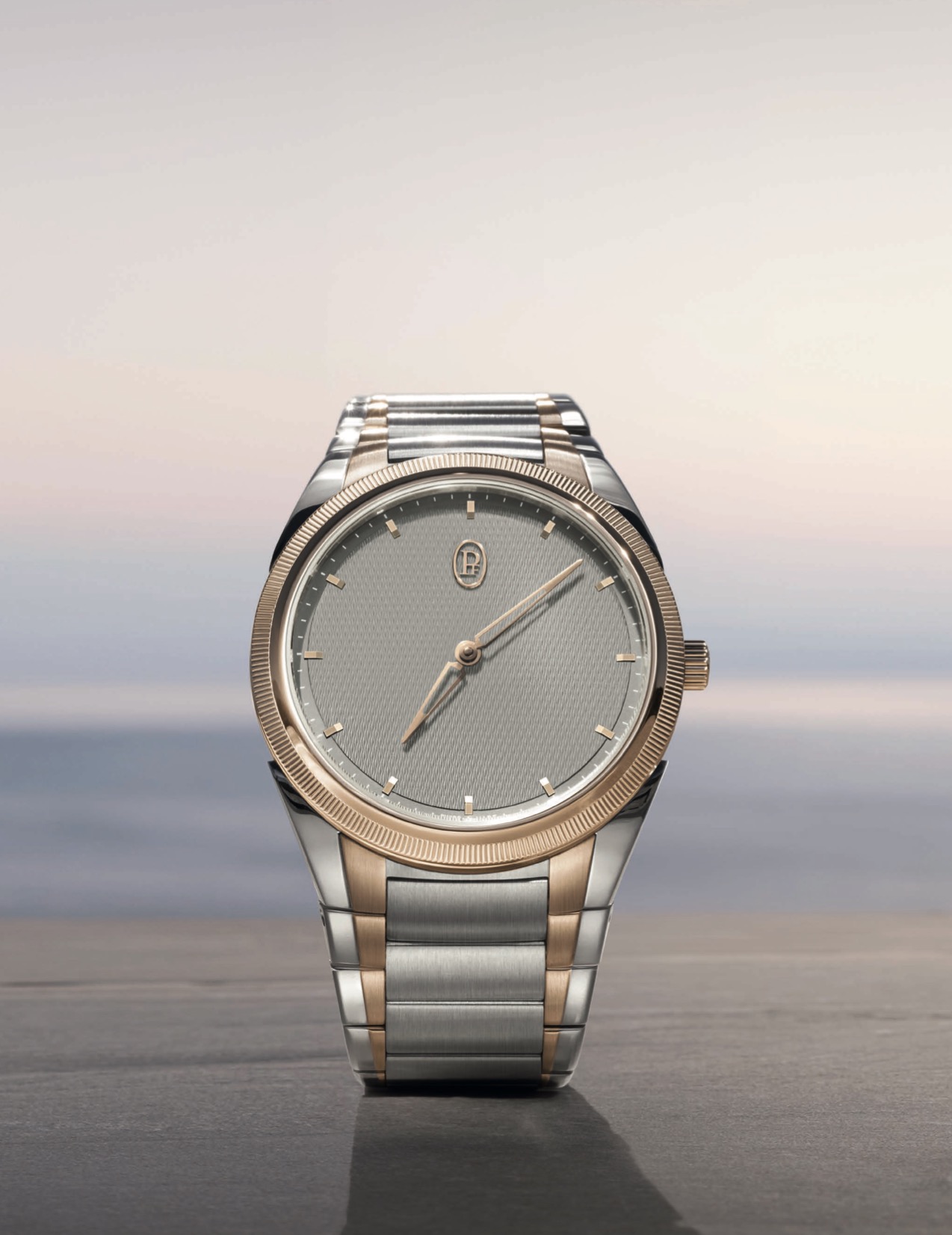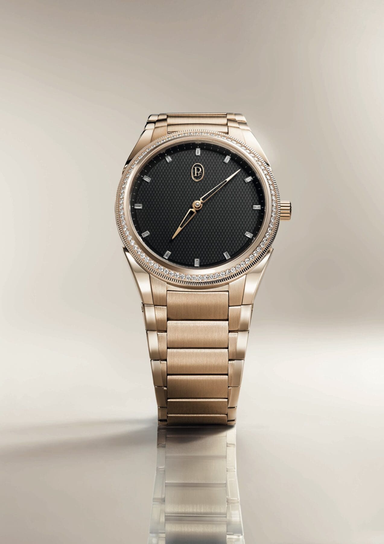 新推出的Tonda PF Automatic 36mm腕錶中,兩款玫瑰金版本的設計令人驚艷,從錶殼到錶圈,再到錶帶皆採用18K玫瑰金材質,並搭配砂金或暖灰兩種色調的錶盤。錶盤鐫刻上精緻的「格狀大麥粒」璣鏤飾紋,12時位置置有代表品牌PF的標誌,立體的長形切割鑽石時標閃耀璀璨光芒,與錶圈上的明亮切割鑽石互相輝映,而2枚三角形通心指針也為整體設計增添活力。