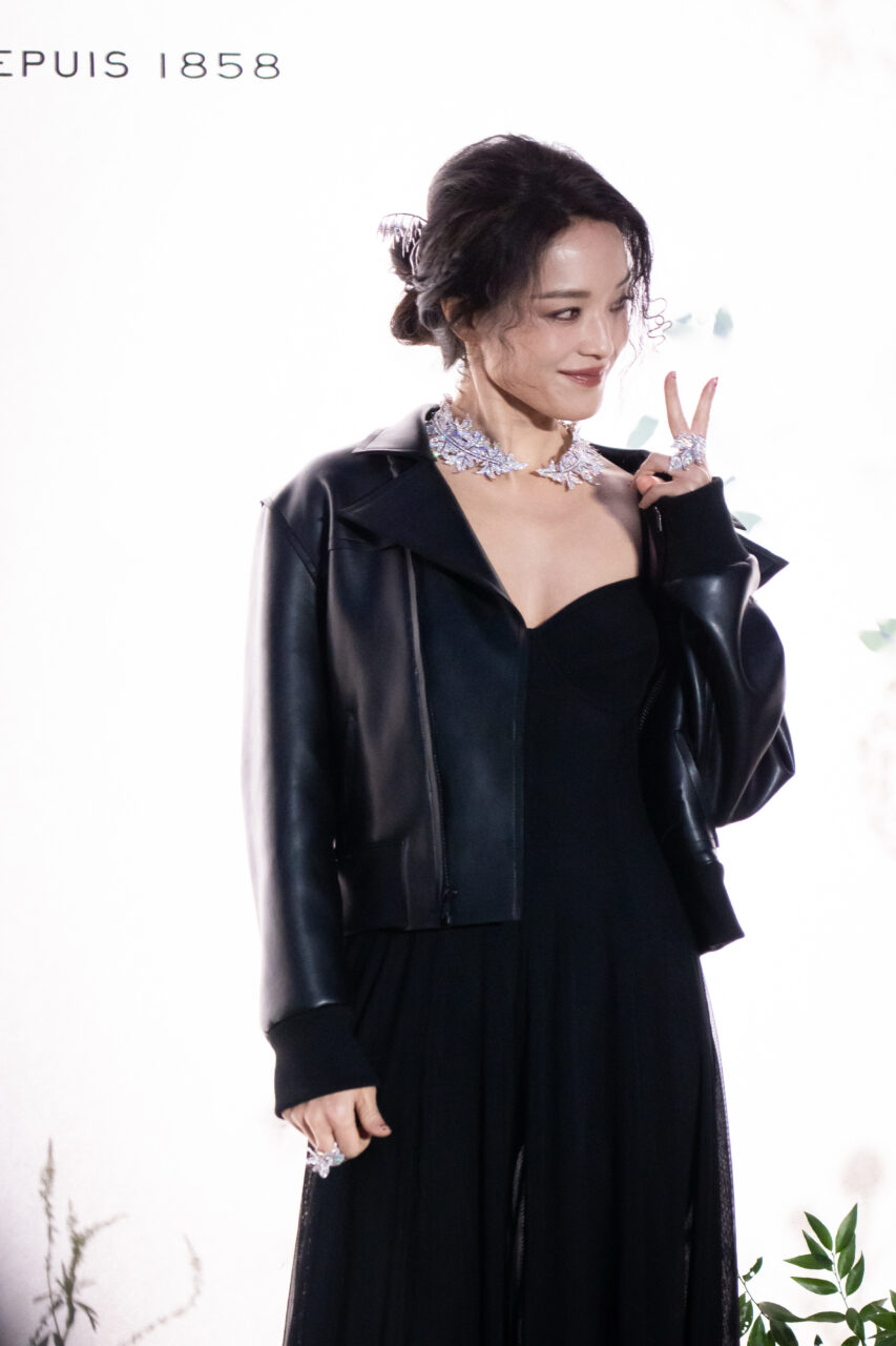 今年3月舒淇出席Boucheron北京珠寶展時,身穿黑色幼肩帶長裙與黑色皮衣外套,並佩戴了品牌全新推出的Histoire de Style「Untamed Nature」系列Chardon薊花鑽石頸鏈。頸鏈以白金製成,表面鋪滿鑽石,薊花的花瓣以層次感展現自然之美,一身全黑色造型更突顯珠寶的奪目光彩,展現強勢的氣質與個人風格。