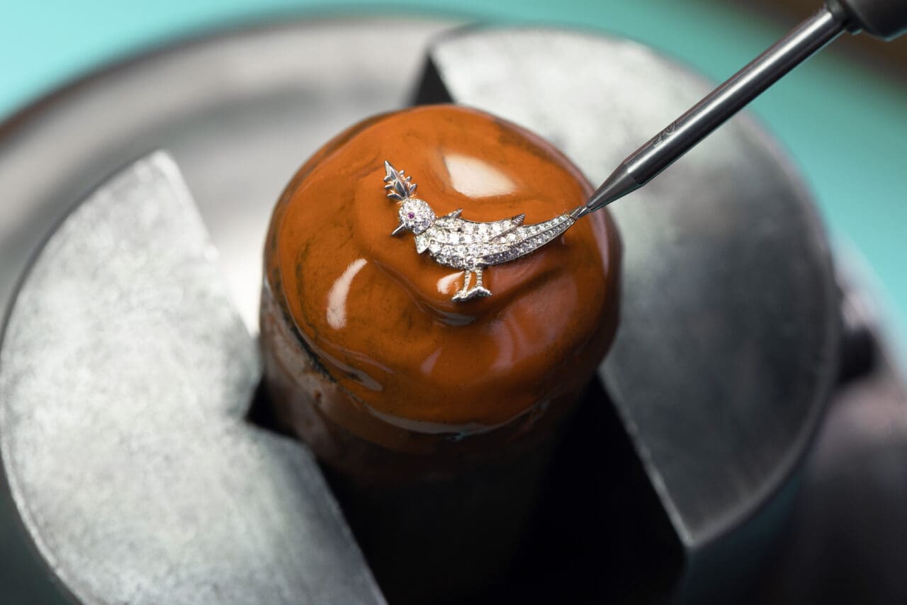 佇立於錶盤上的隱形鑲嵌小鳥飾以鑽石和粉色藍寶石,並同時採用滾珠軸承裝置,讓小鳥能跟隨佩戴者的動作自由躍動,重現了Jean Schlumberger作品的動感魅力。工匠們在打造精緻的小鳥時,需先以人手雕刻其形狀,隨後鑲嵌鑽石,這一過程耗時超過24小時。而用上雪花鑲嵌技術鑲嵌鑽石的錶殼更需要近55小時的精心製作,才能達到如此光滑的效果。