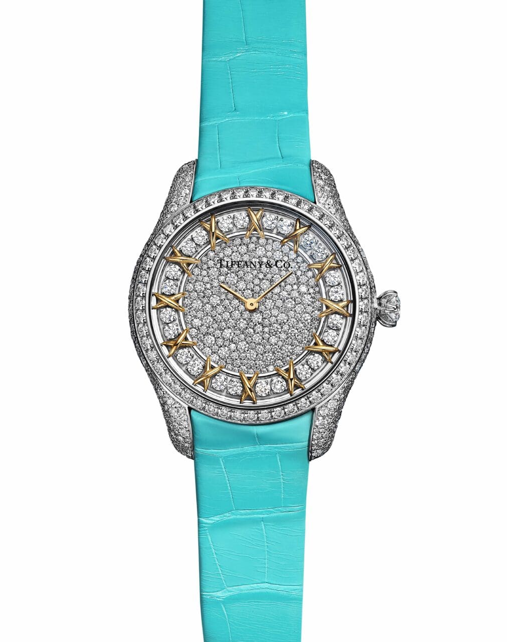 錶背鐫刻上以Jean Schlumberger Floral Arrows 胸針為靈感的太陽光束放射狀圖案, 錶冠則從經典的The Tiffany® Setting六爪鑲嵌鑽戒中汲取靈感,以鑽石點綴,並配襯染上品牌標誌性的「Tiffany Blue」色鱷魚皮革錶帶,每年只作限量生產。