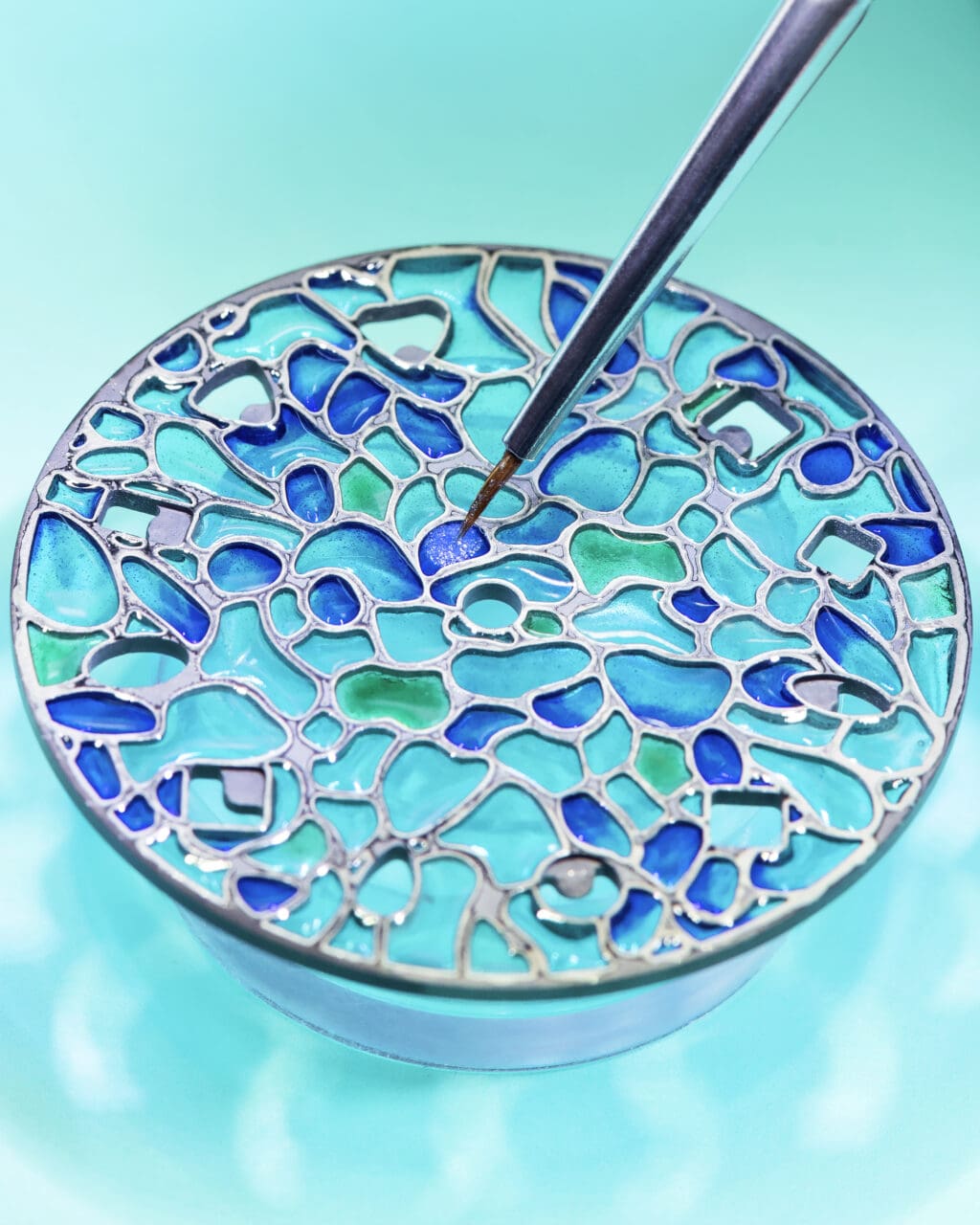 工匠以人手在錶盤的鏤空結構中仔細塗上透明琺瑯。