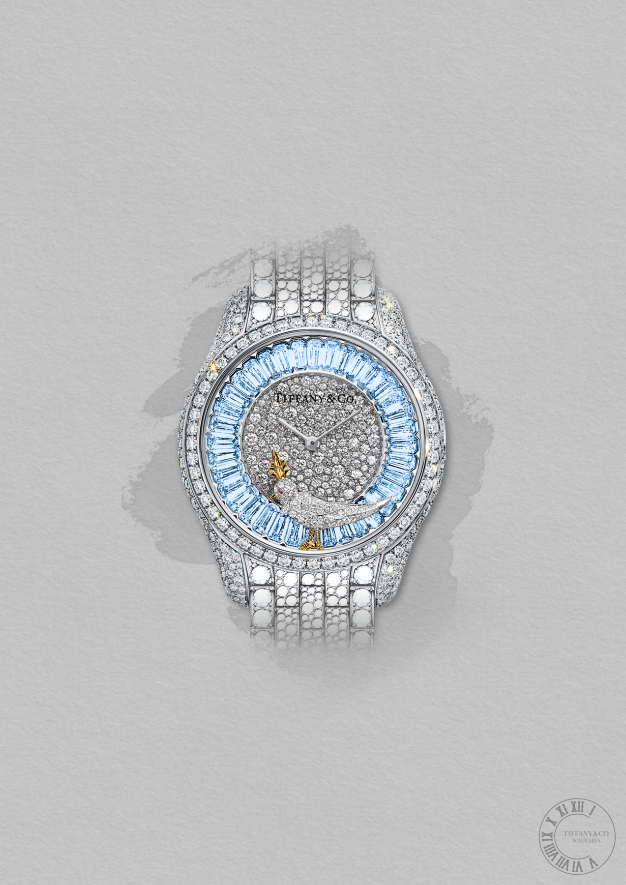 錶盤上的12顆不同切割的鑽石時標亦含有品牌的歷史元素,它們是取材自品牌60年代用於展示不同鑽石切割的平面廣告,像是圓形明亮式切割、長方形切割、枕形切割、Tiffany True®切割、欖尖形切割、阿斯切切割、心形切割、梨形切割、橢圓形切割、祖母綠形切割、三角形切割和公主方形切割,彰顯出品牌擁有高超鑽石切割技術的悠久歷史。另外,整枚腕錶更以人手鑲嵌上超過700顆的鑽石,難怪又要花上70小時完成工序,絕對是一枚用心製作的珠寶腕錶。