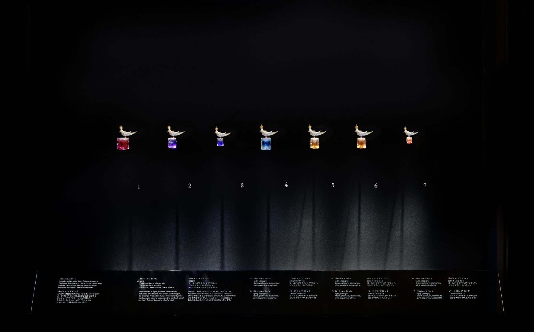 《Tiffany Wonder》前所未見地將七隻Bird on a Rock胸針放在一起展示,輝映着色彩斑斕的寶石光芒。
