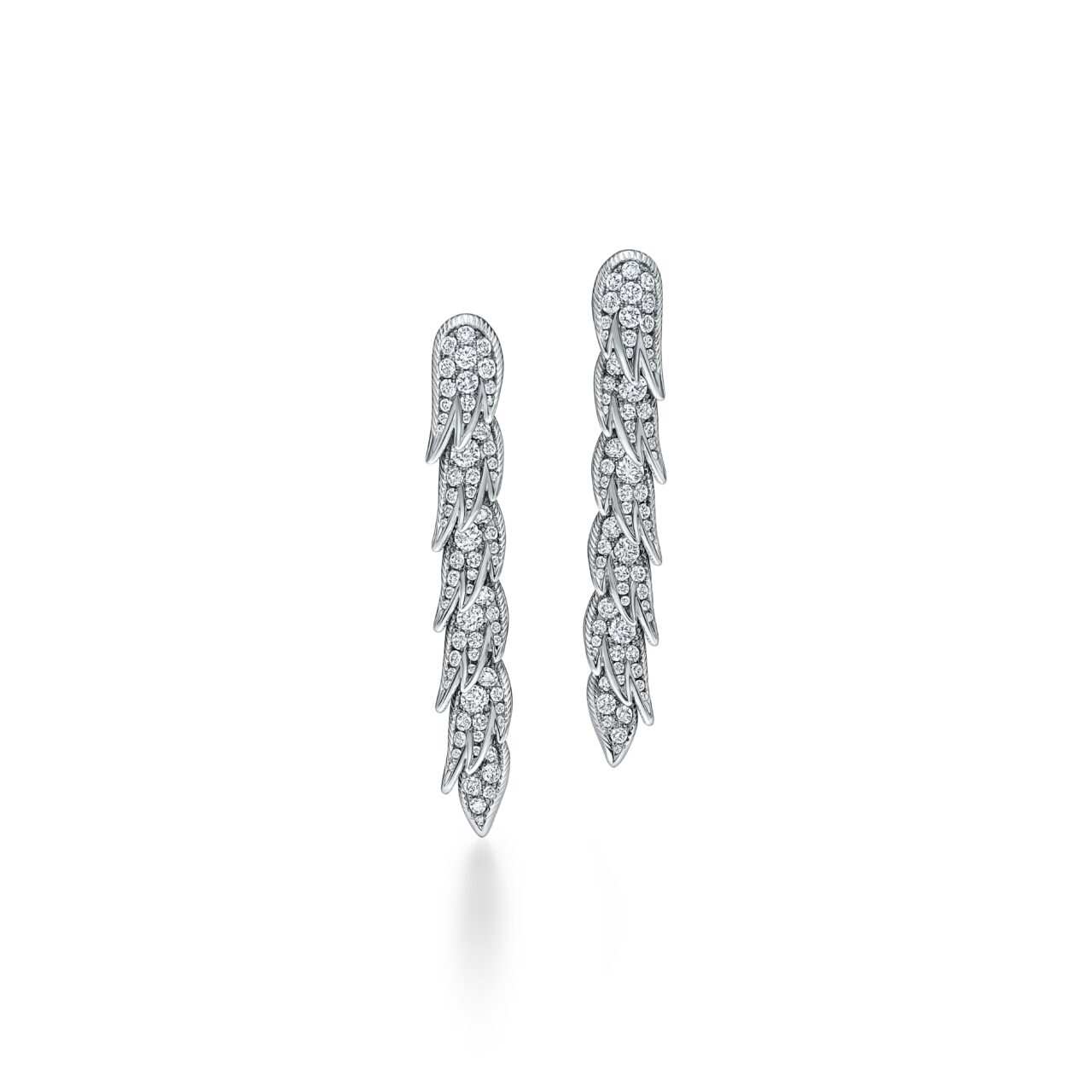Wings 系列以抽象羽翼為靈感,巧妙運用隱形鑲嵌技術,讓鑽石宛如懸浮於半空。羽毛造型與波浪邊緣層層交疊,襯托出細膩的視覺效果,當中更包括一款可轉換式耳環,從搶眼垂墜造型到精緻耳釘,四種佩戴方式,變化多端的靈活性,展現佩戴者的獨特風格。