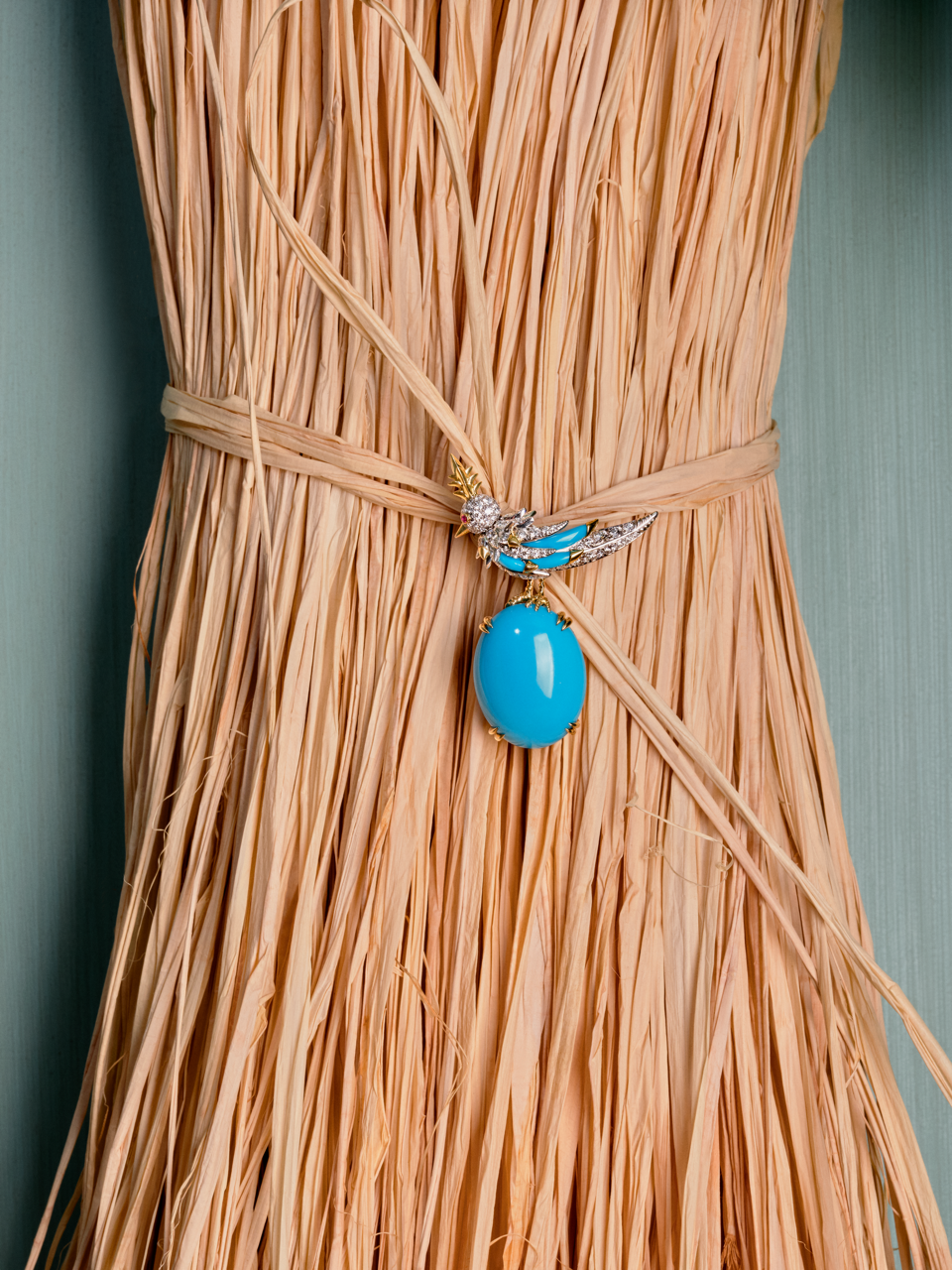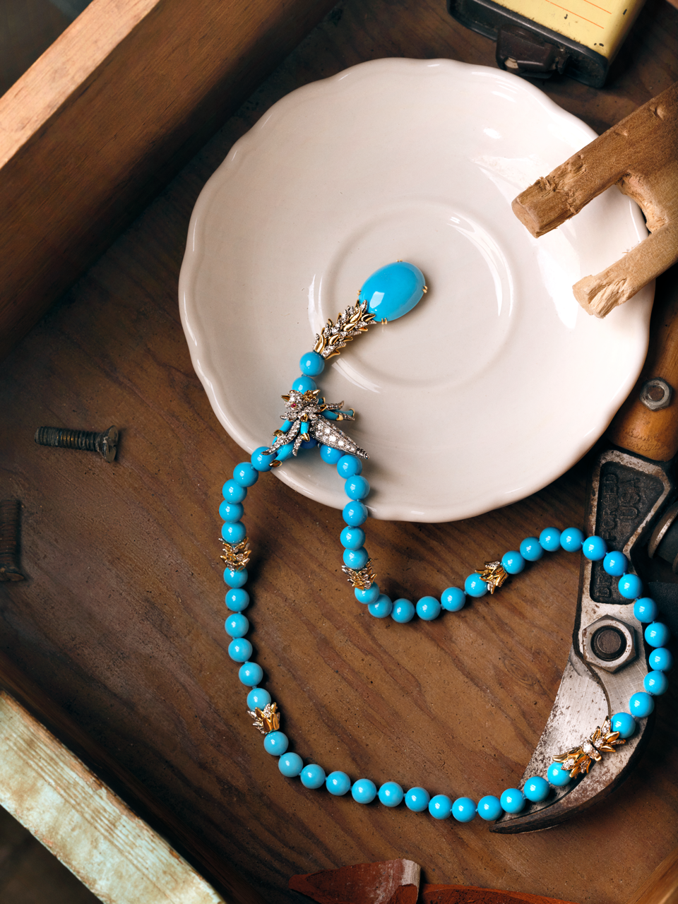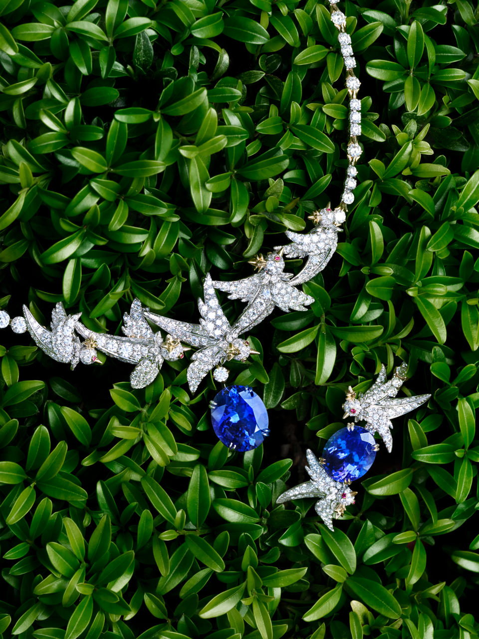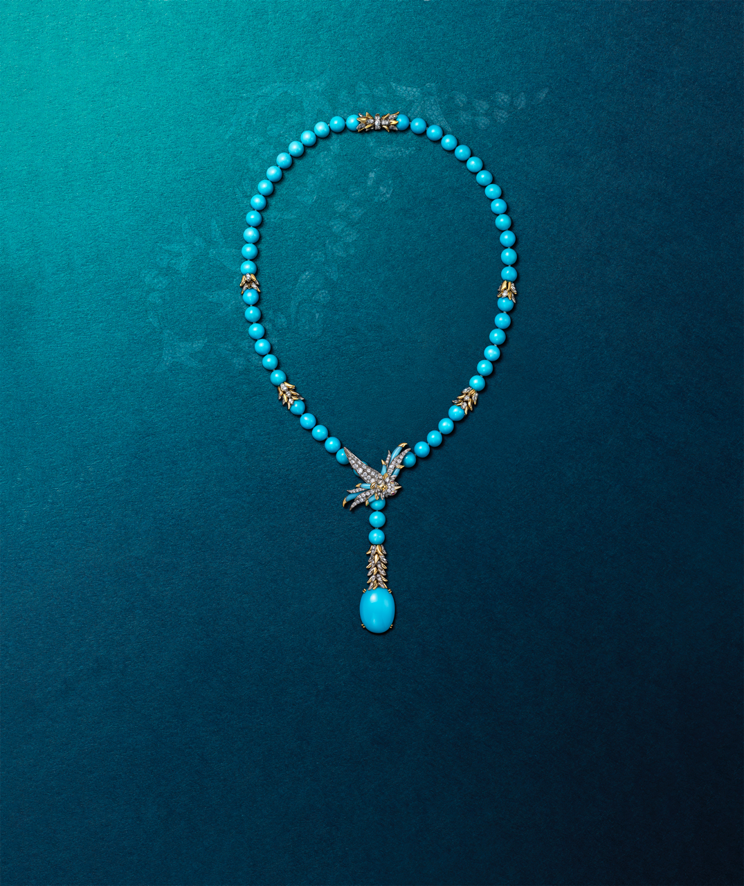 全新系列包含兩套非凡的高級珠寶套組,一套以坦桑石為主角,由 Tiffany & Co. 於 1968 年首次引進的寶石,擁有深邃藍紫光芒,成就神秘且高貴的氣質;另一套則以綠松石為主軸,這款寶石植根於品牌設計傳承之中,同時向 Schlumberger 致敬,他曾大膽將綠松石與鑽石等珍稀寶石巧妙結合。以綠松石為主題頸鍊由鑽石鳥兒銜起一串圓潤的綠松石珠串,綴以金質羽毛與碩大吊墜,展現自然與工藝的完美交融。