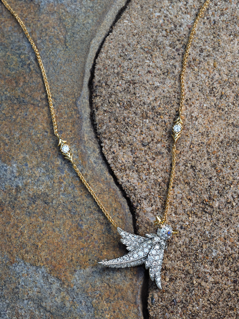 Bird on a Rock 系列的誕生可追溯至 1965 年,由傳奇珠寶設計師 Jean Schlumberger 為 Tiffany & Co. 創作。靈感源自他遊歷亞洲及加勒比海時邂逅的稀有雀鳥,並在 Oak Spring Garden 的自然氛圍中,將腦海中的形象描繪出來,孕育出這款融合自然與幻想的傳奇設計。鳥兒輕巧地停留在寶石之上,象徵靈魂自由地在追逐夢想間飛翔,成為品牌高級珠寶歷史中最具代表性的作品之一。
