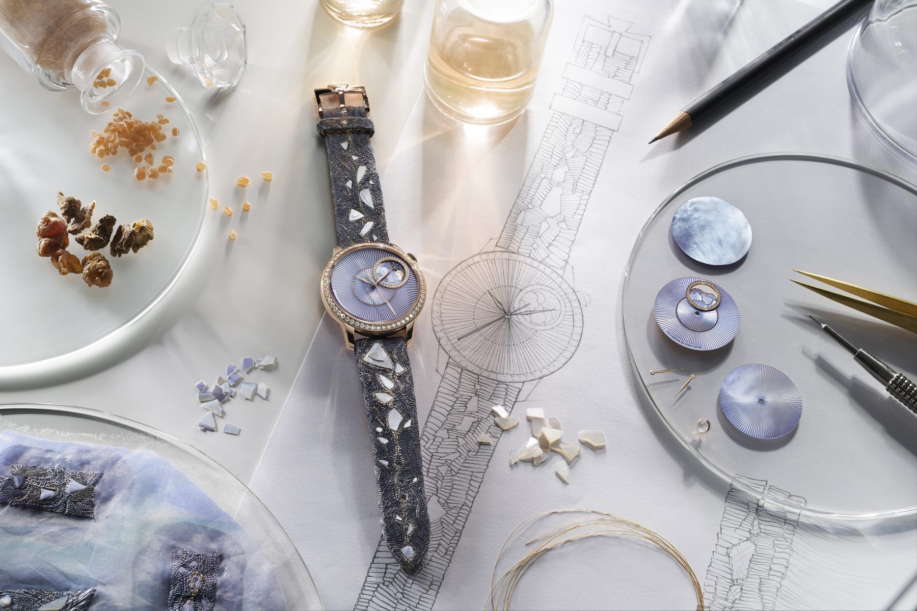 這枚腕錶的另一個焦點是與調香大師Dominique Ropion共創專屬香氛,彼此試聞數十種香料,反覆進行測試,試圖用氣味捕捉時間,將香氛精華濃縮為微小的液滴,包裹於納米膠囊內,再滲透至錶帶的各個部件(襯裡、固定環和刺繡圖案);當使用者的腕間有所動作,或是錶帶與肌膚相摩擦,納米膠囊中的香氛會自然釋放香氣,Yiqing Yin對此合作謂:「我喜歡跨界合作,探索我不熟悉的領域,這樣才會有全新的發現。我和Dominique早就有過合作,我們彼此都有一定對細節的執着,這次我們探討如何將時間轉化為迷人的香氣,想起了潮汐的景象,像我的作品中的那些褶皺元素、照耀和溫暖着我們並塑造人們日常生活節律的太陽,還有紫水晶及其顏色關於時間的隱喻。」