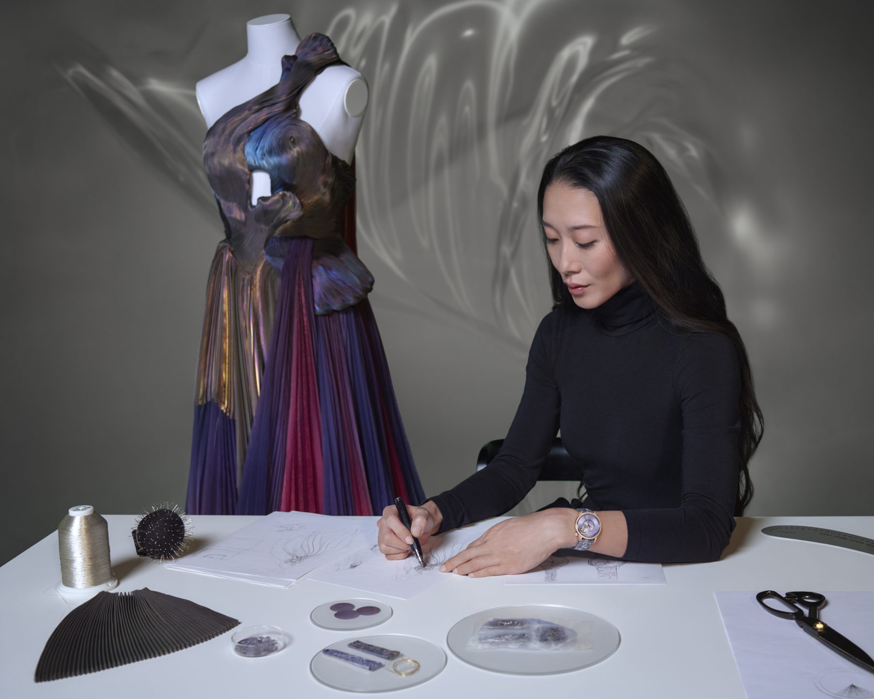 是次三方合作,Yiqing Yin形容需要跳出comfort zone,因為當你打造袖褶時,會有一種無法預測結果的「工藝美感」,如何在製錶上達到既輕盈又可靠的設計,反而成為她的一大挑戰,「對我來說變化是創新的起源,我想到這創意故事,嘗試構解一個全新的維度,賦予晚間溫潤的情感,欣賞想像力在獨特節奏下翩翩起舞的畫面,從刺繡紋理、褶皺工藝再到自然繾綣的起伏美感,這枚腕錶展現了『永恆』與『轉𣊬』 之間,透過一款擁有專屬香氛的時計,佩戴者可以享受一次穿越時間界限的感官體驗。」說穿了,有了實在的故事,自然是走向成功設計道路的開端;下一步,是如何透過工藝實踐想像。