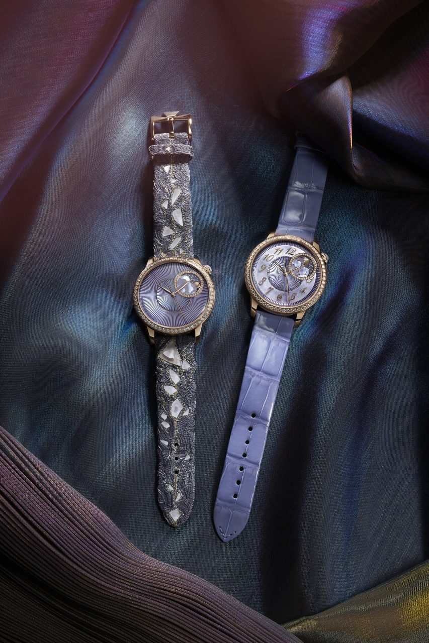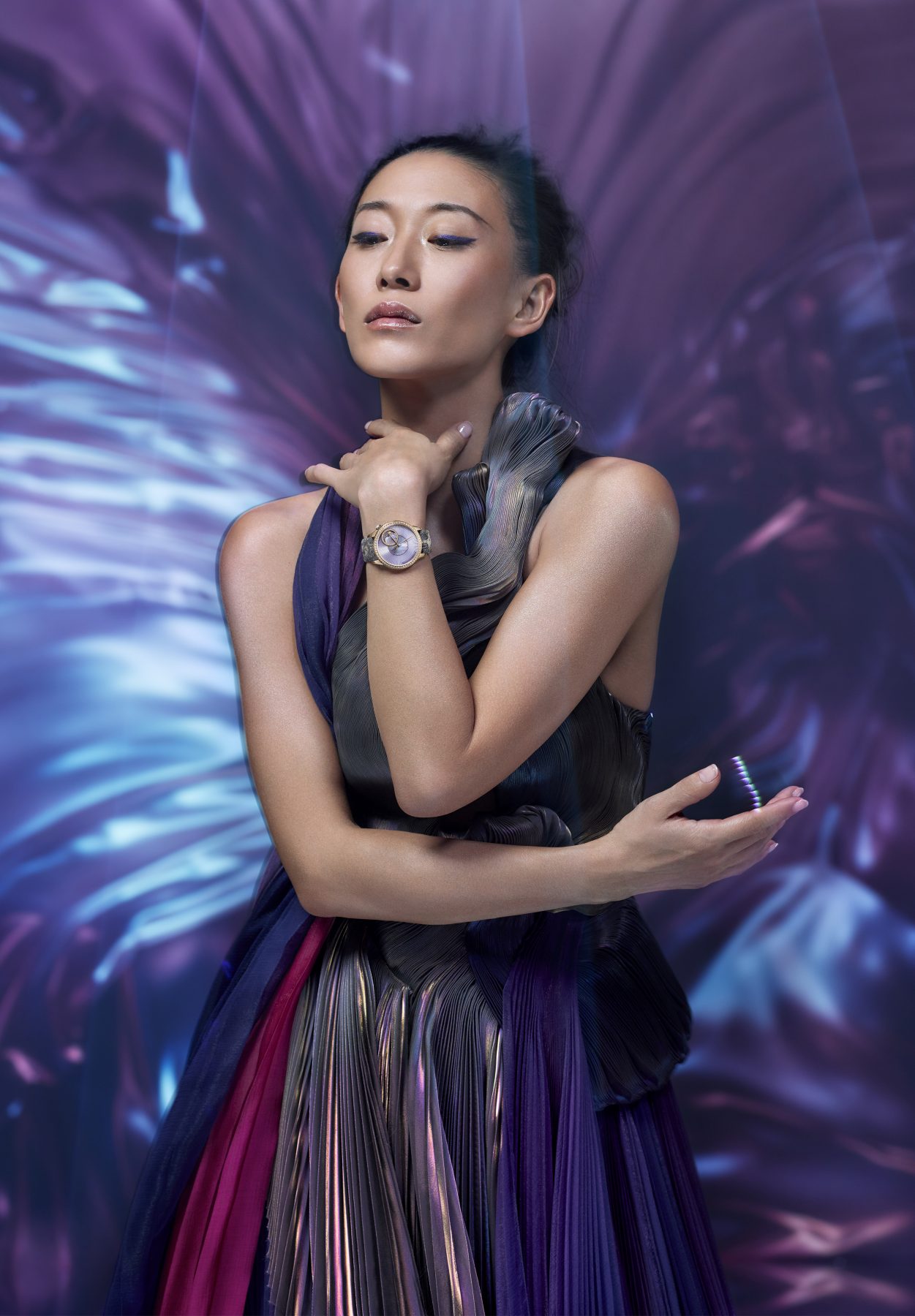 Égérie系列“The Pleats of Time”概念腕錶以37mm粉紅金鑲鑽錶殼為賣點,當中捨棄時標設計,除了月相,可以看到細膩褶皺紋飾在珍珠貝母材質錶盤上錯落鋪開,至於錶盤中央的紋飾周圍環繞一圈精緻的金質珠粒,外圈部分則呈現連貫起伏的紋理效果。錶帶則飾有滿滿藝術感的刺繡紋理,以絲線編織而成,其間鑲嵌細密的珍珠貝母碎片,Yiqing Yin續說:「作為一名高訂時裝設計師,我對於製錶技藝確實不甚瞭解,需要在其技術框架內找到與我的藝術創作相契合的平衡點。我希望盡量精簡錶盤的設計,以月相顯示帶來的浪漫詩意及對時間的直覺感知為核心,腕錶和禮裙(她還特意製作一套限定高訂)上的『褶皺』紋理形成一種動態感,賦予作品柔韌的張力和承載更多可能性的空間。它象徵原本平坦的錶面所蘊含的自由無拘的表現力。」說到為何選擇淡雅丁香紫配色?Yiqing Yin笑言它是最為柔美的色調,令人想到稍瞬即逝的白日夢,自己的作品亦常用銀紫色面料疊搭淺丁香紫色或雲紋紫色作設計;說起來,特別有詩意。
