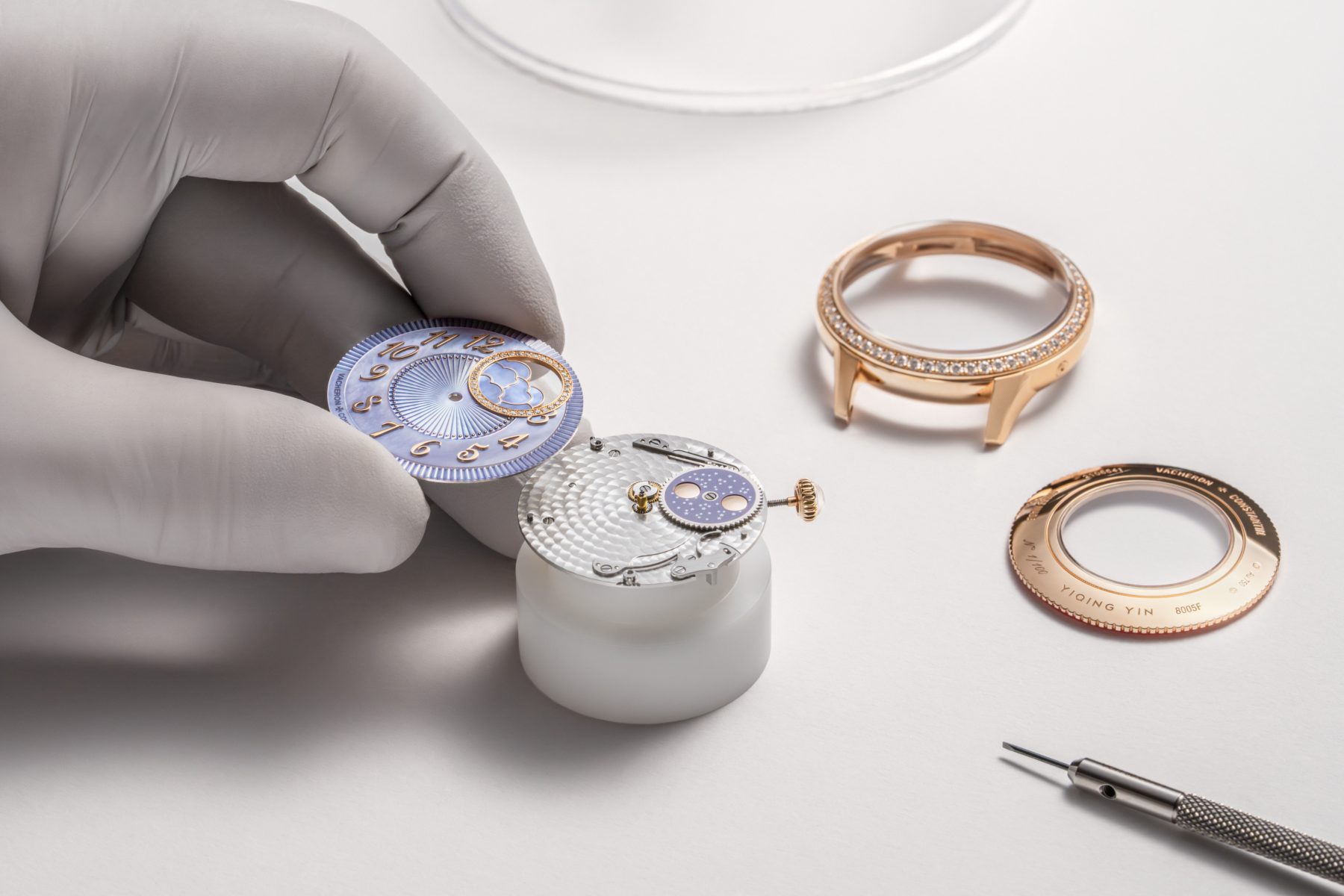 另外,Égérie 系列亦推出一款限量僅100枚的月相腕錶新作,同樣由Yiqing Yin所設計(其姓名刻紋精心鐫刻於錶背,還有獨立編號),腕錶配備3條可快速替換錶帶,採用直徑37mm的粉紅金錶殼搭配鑲鑽錶圈和精緻的丁香紫色調錶盤。珍珠貝母錶盤交替呈現光面質感與褶皺紋飾,月相顯示盤巧妙呈於品牌標識與錶冠之間構成的一條似有若無的對角線上。必須要說的是, 我們都清楚知道珍珠貝母是一種極為脆弱的材質,因此要在錶表面雕琢出「褶皺」紋理時要格外小心翼翼,而褶皺圖案周圍環繞一圈精巧的金質珠粒,由手工逐一鑲貼而成,充分反映品牌追求工藝堅持的淋漓盡致。Vacheron Constantin早在18與19世紀之交, 便推出多款女士懷錶作品,配備報時等複雜功能,搭配琺瑯彩繪、手工雕刻或寶石鑲嵌裝飾,後來的女士腕錶更是不斷推陳出新。雖然Égérie系列於2020年才誕生,但它為女性高級腕錶市場無疑帶來嶄新面貌;是次三方聯乘不是只為驚喜,即使腕錶看似柔和,但你總能從中感受Yiqing Yin多年來對美學的追求與不屈不撓的堅定信念,詮釋何謂真正的women power。