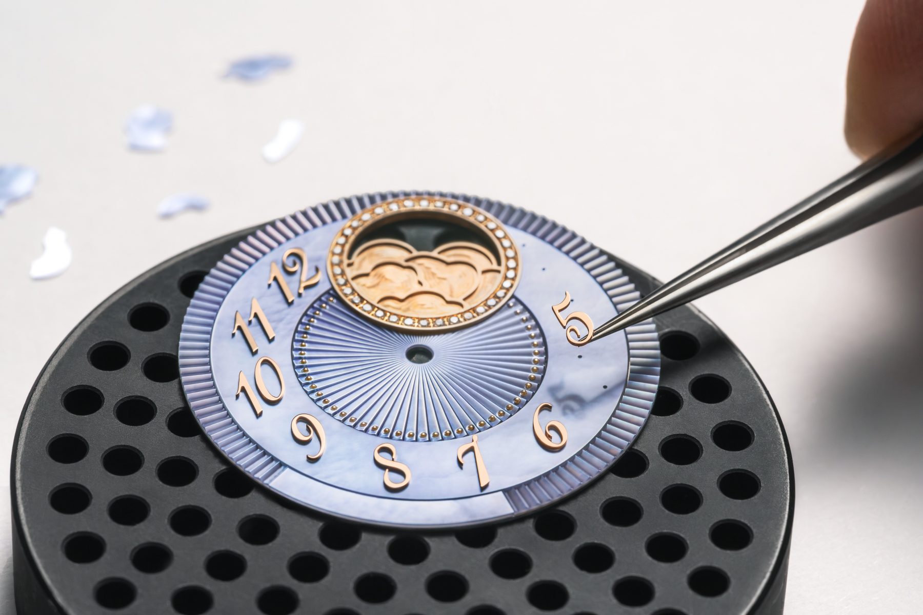 細膩褶皺紋飾在珍珠貝母材質錶盤上錯落鋪開。