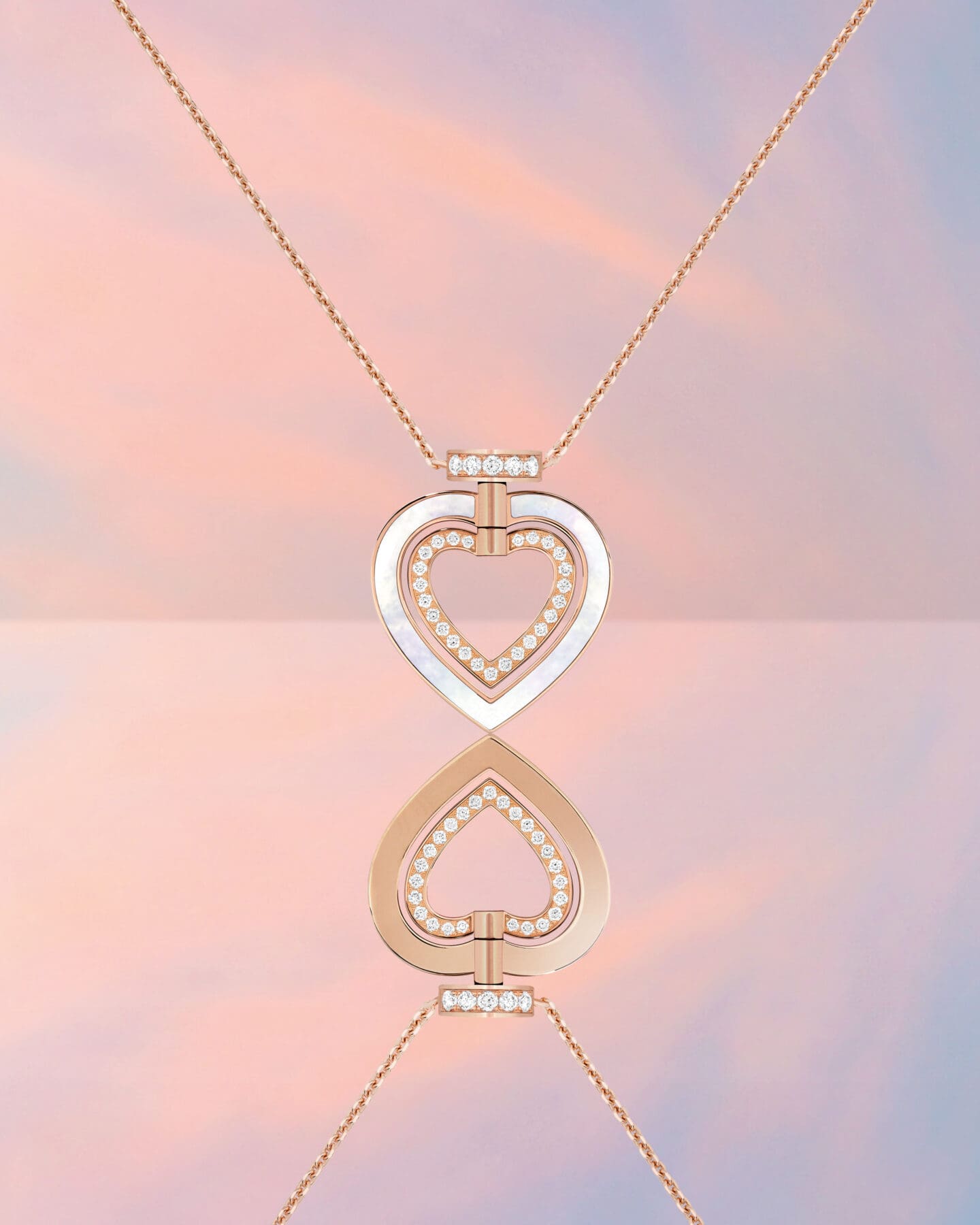 法國珠寶品牌FRED在充滿愛意的2月為「Hypnotic」系列譜寫全新篇章,推出全新尺寸的Pretty Woman Hypnotic項鏈。這款項鏈巧妙融合了2顆可活動的心形設計,透過可拆卸的鑽石與金質釦環相連。第一顆心形飾以珍珠母貝,散發柔和光澤;第二顆則以鑽石點綴,閃耀璀璨光芒。兩顆心形均可翻轉,佩戴者可根據心情或場合自由搭配,呈現出4種不同風格,