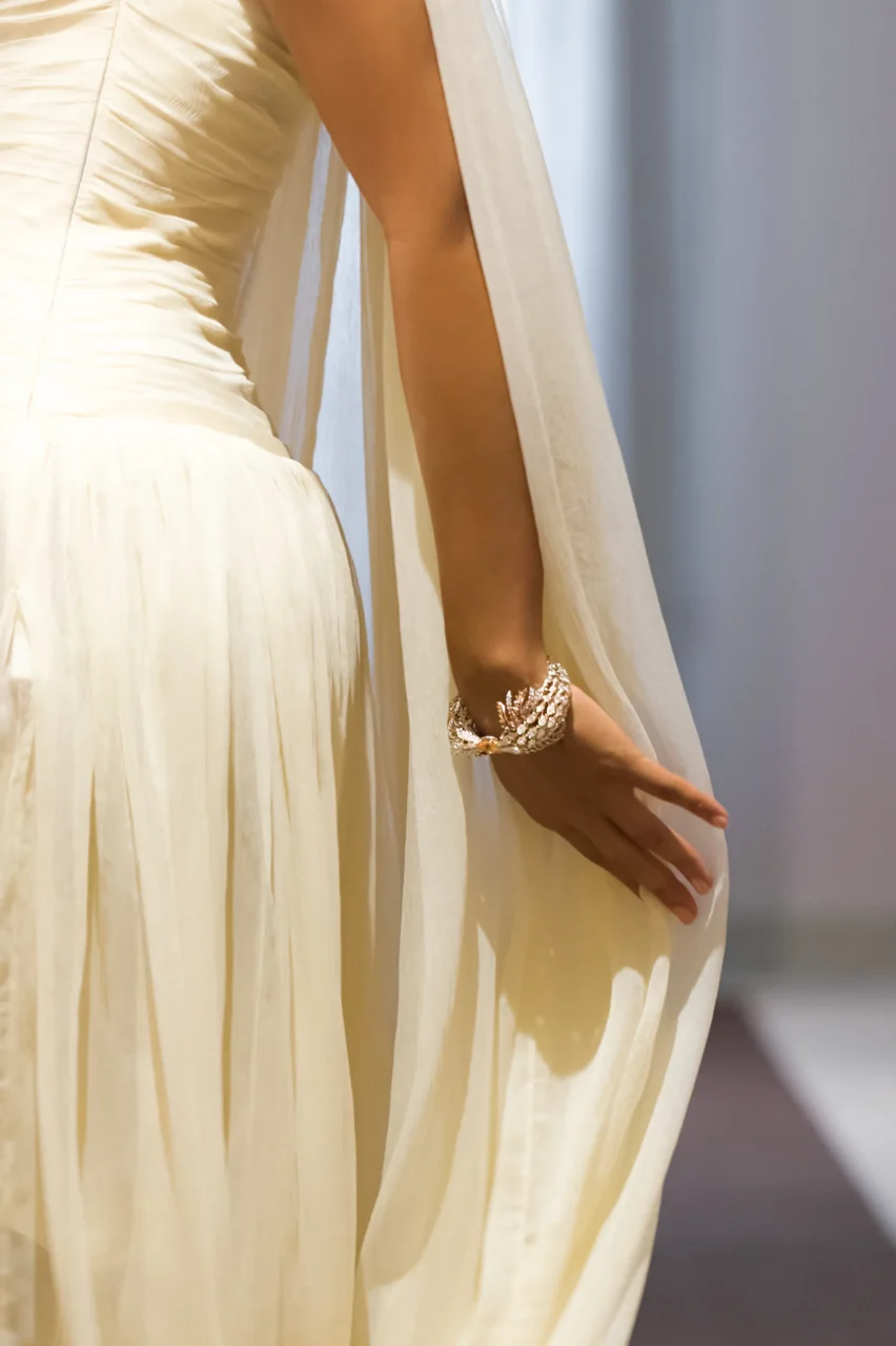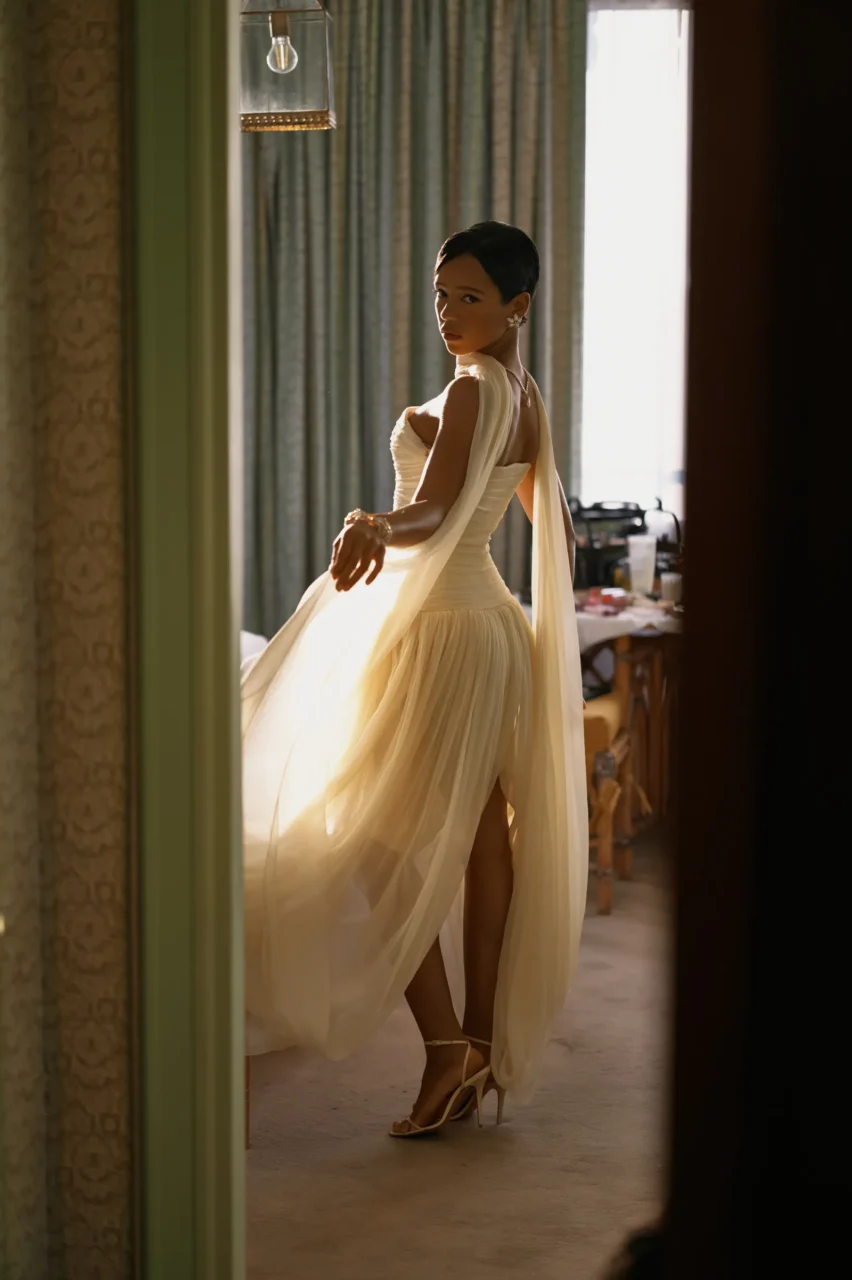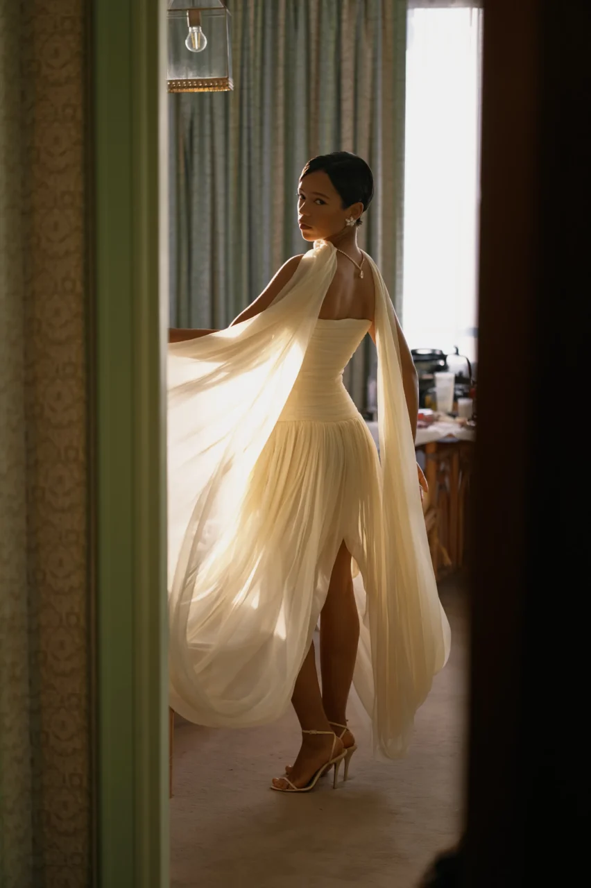 當然,除了評審職責之外,參與威尼斯影展的最大樂趣就是悉心裝扮。Taylor Russell在《Maria》首映禮上成為全場焦點,她戴上Tiffany & Co.閃閃發光的珠寶首飾,包括由鉑金、黃金和超過 11 卡鑽石製成的吊墜項鏈、Gloper耳環,以及由鉑金、黃金、藍寶石、紅碧璽和鑽石製成的手鏈,點綴飄逸的Loewe垂墜感淺奶油黃色連身裙。「雪紡感覺輕鬆輕盈,連身裙本身的形狀(與頸巾相連)包含了我在許多復古參考中所喜歡的大部分元素,以及實踐了我在威尼斯影展穿上連身裙的願望。」Russell 亦談到她與造型師Jahleel Weaver的合作成果, 「這是我們合作中,我最喜歡的裙子之一。」