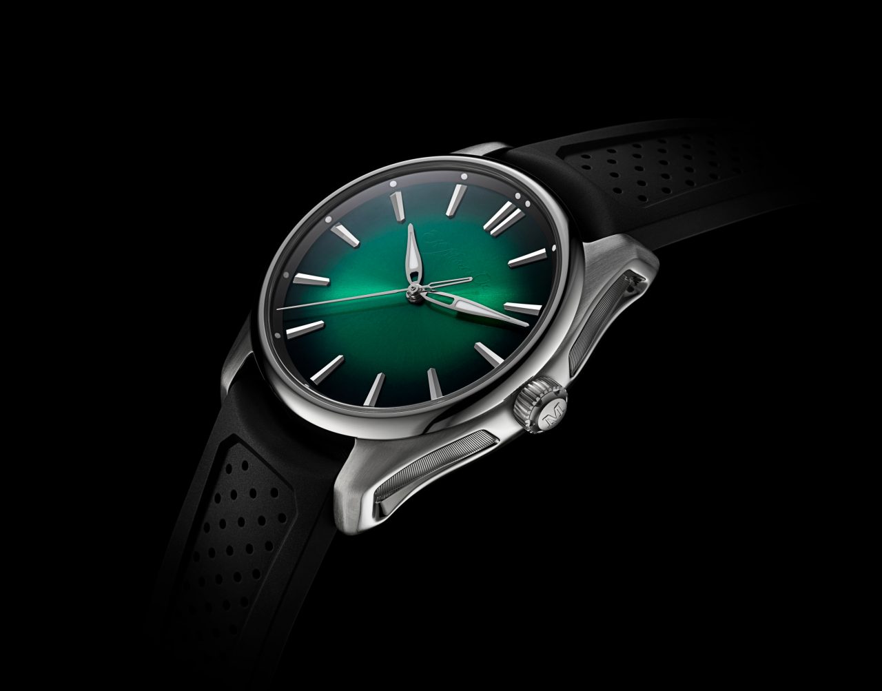 另一款稱為宇宙綠煙燻錶盤的開拓者大三針款式,葉形時針和分針覆有Super-LumiNova®夜光塗層,立體刻面鑲貼時標設計與其放射狀太陽紋錶面充斥強烈對比,棄秉任何額外細節,使腕錶更引人入勝。