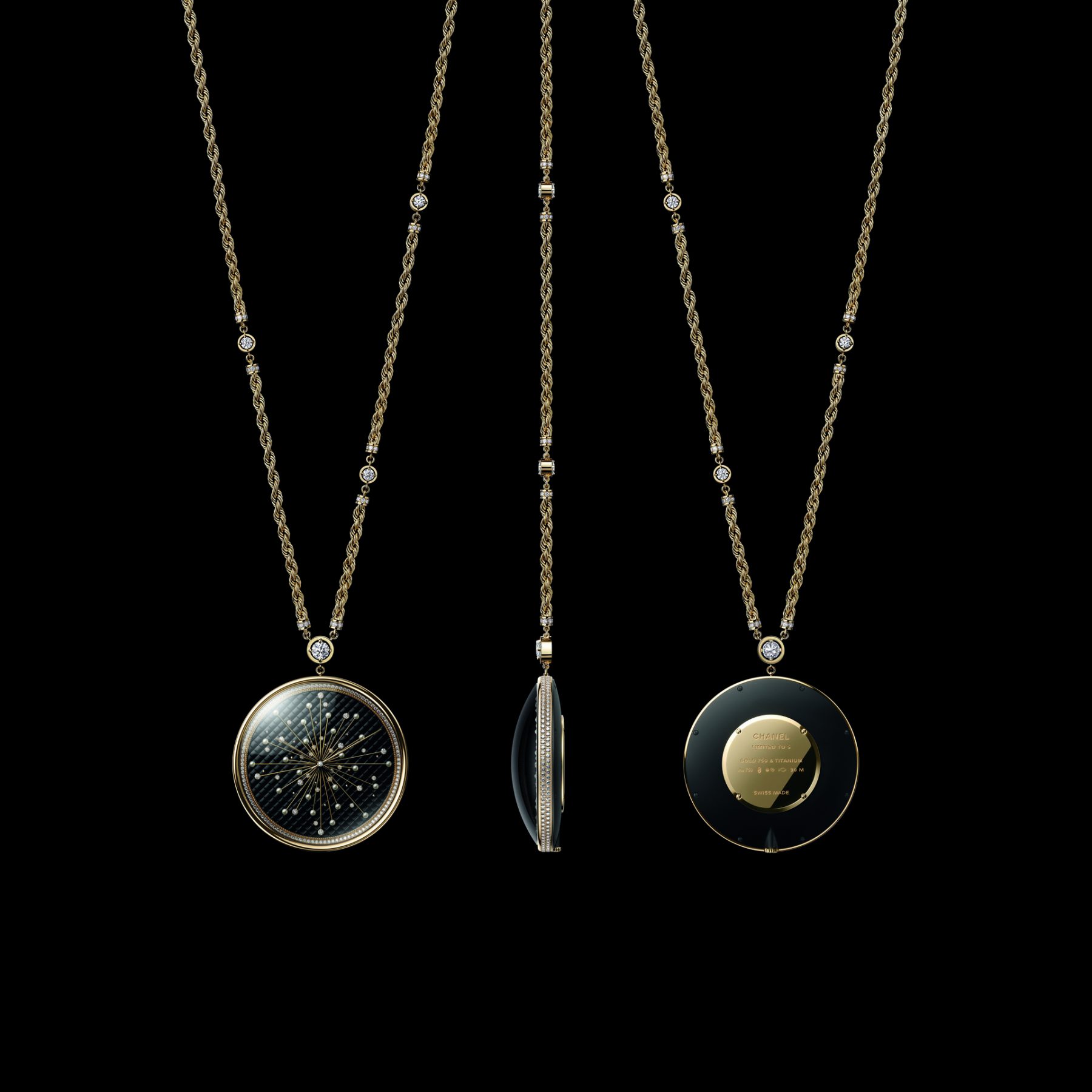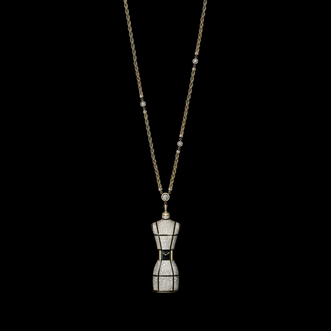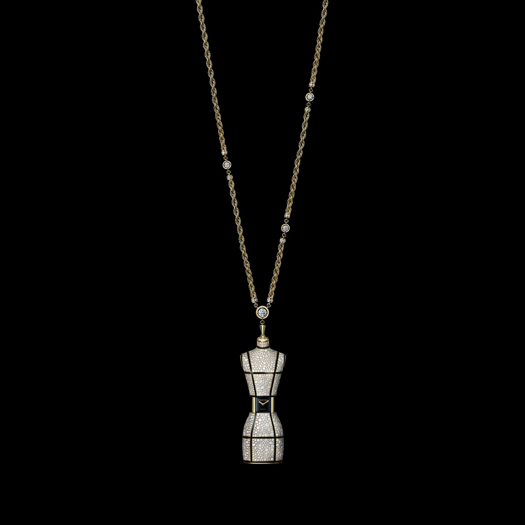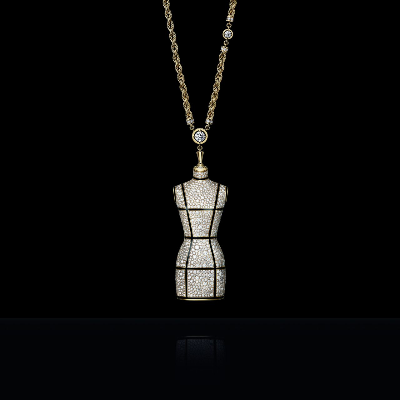 Chanel高訂服半身像的身影除了在J12腕錶上以平面姿態登場外,更幻化成立體吊墜項鏈模樣的秘密腕錶,以18K黃金材質和1,743顆總重達25.83卡的美鑽在你的鎖骨處閃閃發亮。當輕輕拉下高訂服半身像的下擺位置,位於腰間的黑色漆面錶盤便會優雅地呈現,內載的高精準石英機芯隨即透過纖巧的18K黃金指針顯示時間。