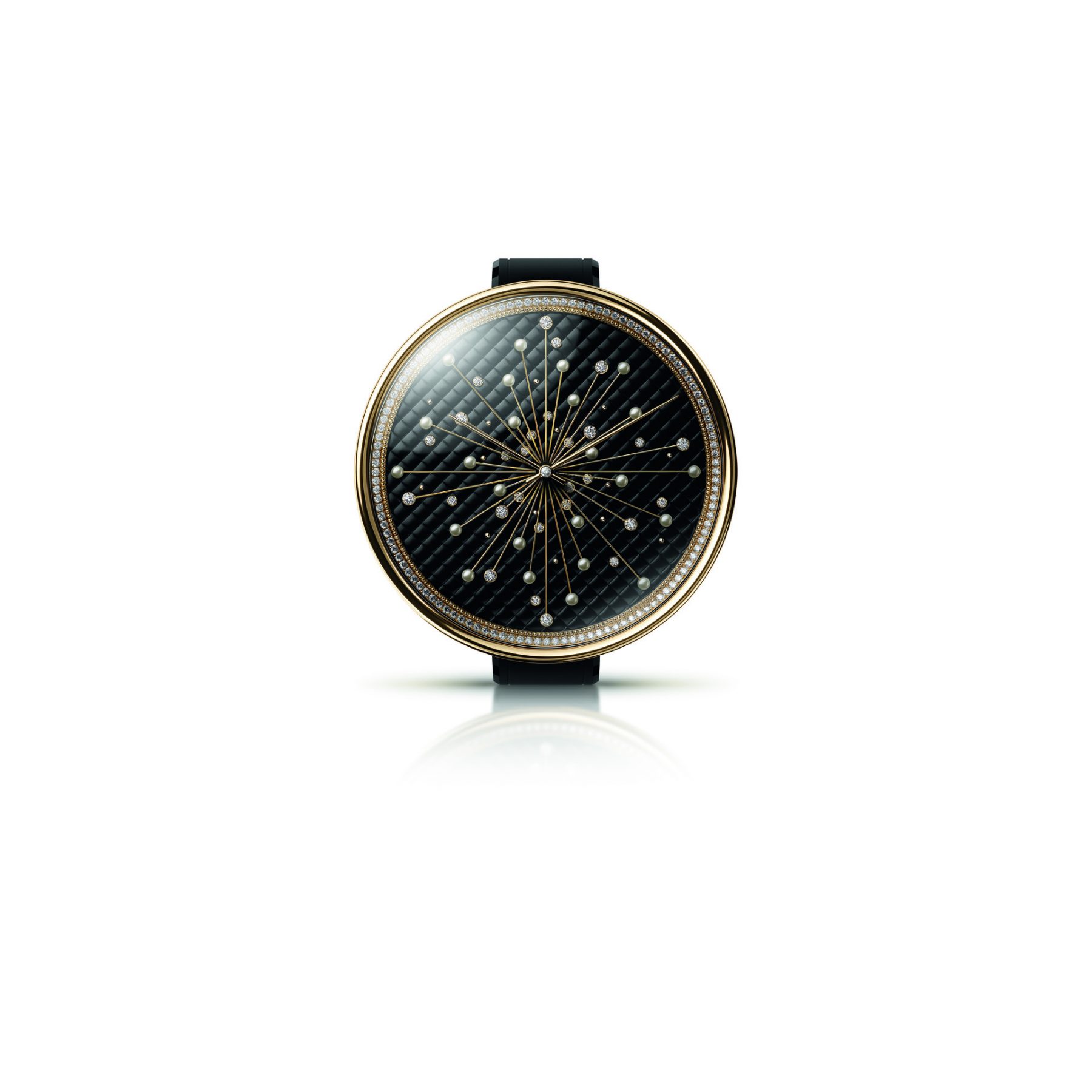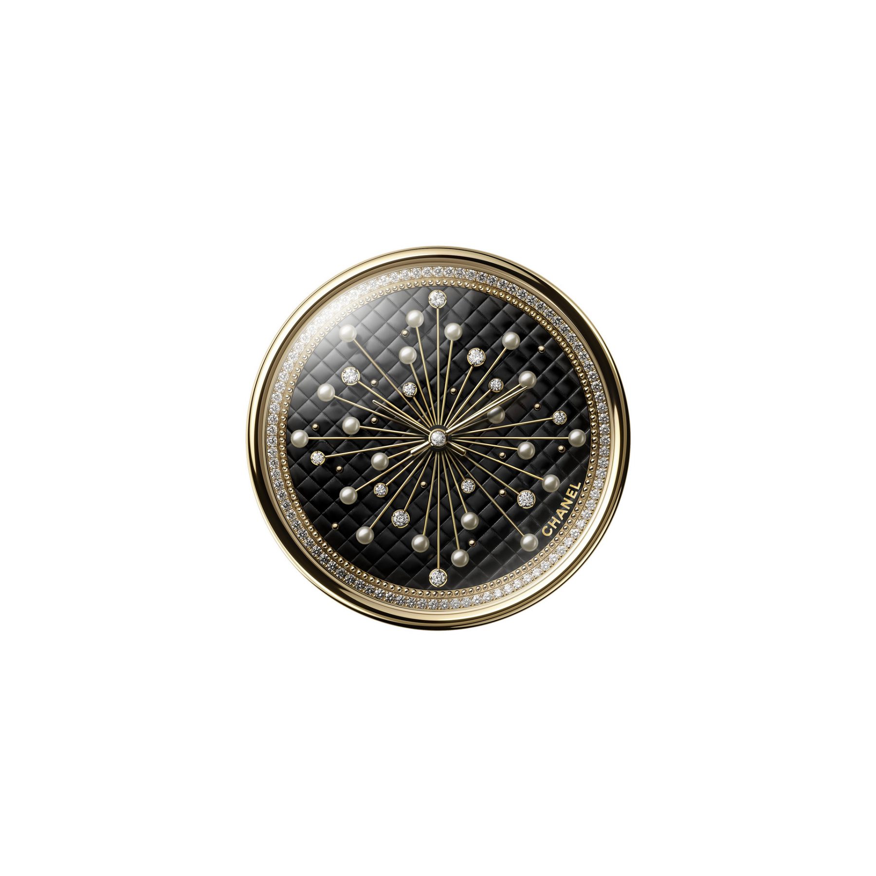 Chanel Mademoiselle Privé Pincushion 時計系列靈感源自裁縫師工作中使用的針墊上的大頭針,每款作品皆以凸圓形的水晶錶殼為基底,並使用黃金、鑽石、珍珠母貝和縞瑪瑙等珍貴材質精心打造而成。除了手環形態,它還項鏈和戒指的模樣呈現,而不論55毫米和40毫米版的錶身皆以18K黃金為材質,錶盤上的大頭針則以不同大小的華麗美鑽和珍珠所呈現,巧妙地將平凡轉化成非凡之美。
