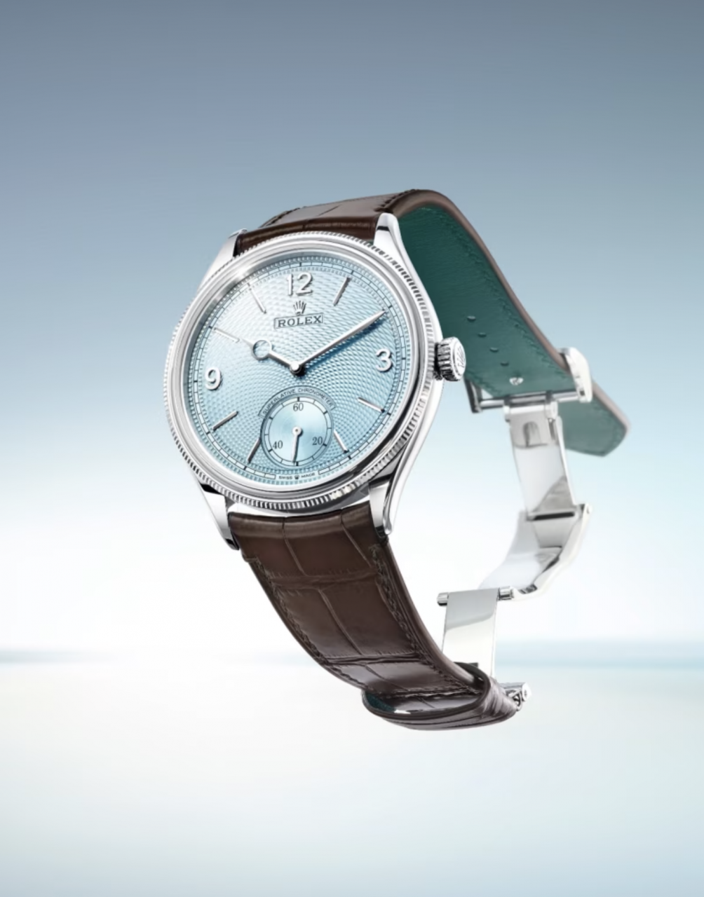 Rolex Perpetual1908的設計簡潔而個性鮮明。冰藍色錶面上的阿拉伯數字3、9、12和棒狀時標形成鮮明對比,與6點鐘位置的小秒針盤相互呼應。此外,錶圈採用內凹的圓弧紋理設計,搭配鱷魚皮錶帶,增添了優雅而別緻的風采。