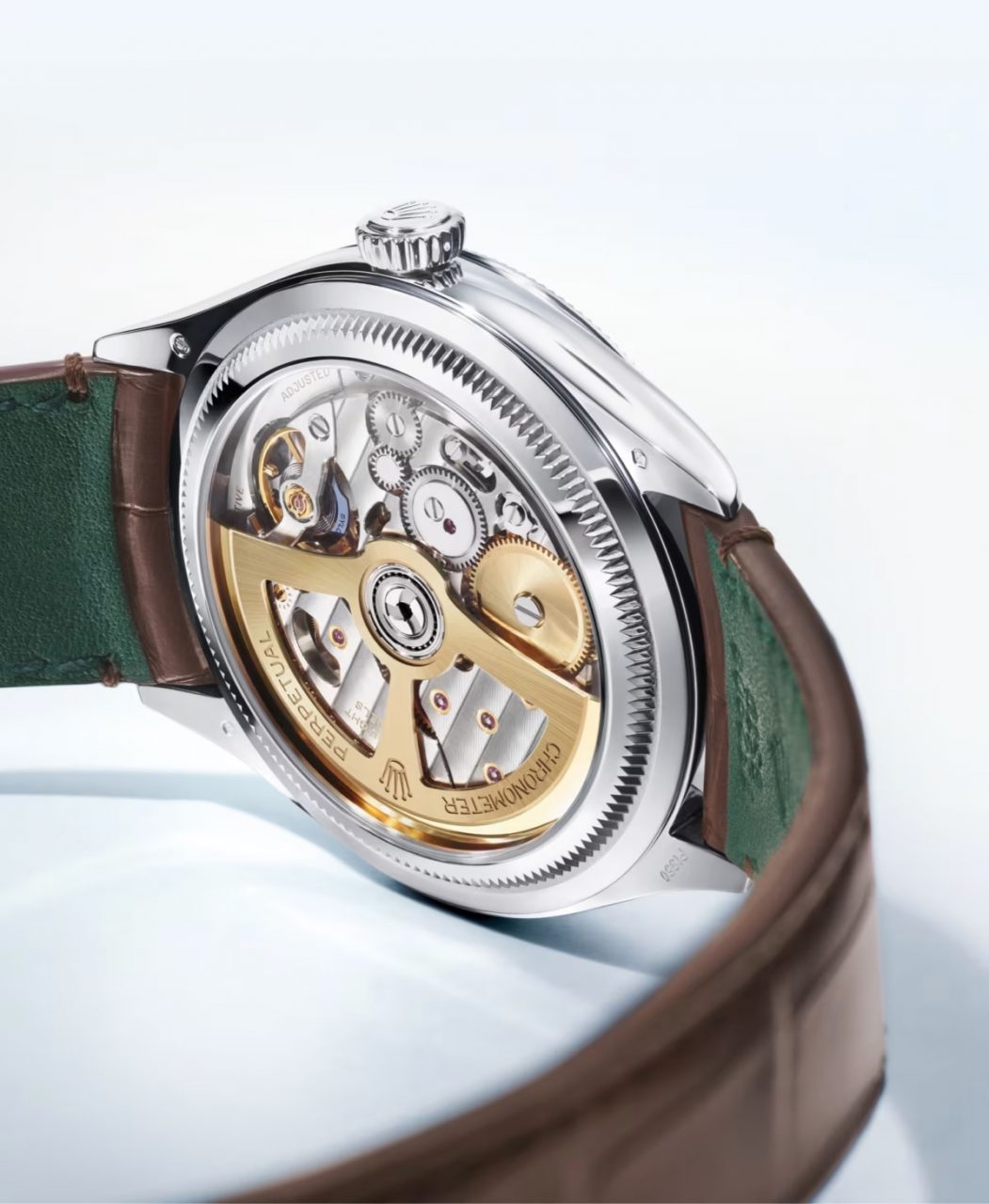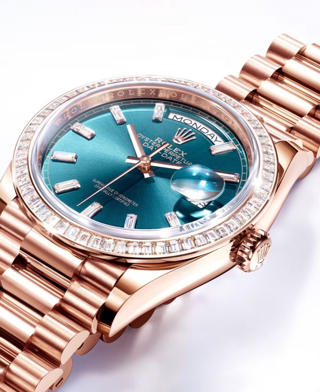 其中最引人注目的當屬首次選用藍綠色錶盤的18K玫瑰金Day-Date 36,其外圈鑲嵌着60顆梯形鑽石,在簡約設計中增添華麗光彩;而Day-Date 40 18K玫瑰金款則採用漸變灰錶面,其羅馬數字時標與錶盤中心到邊緣的暗色區域之間呈現出細膩過渡。所搭載的3255自動上鏈機芯,動力儲備約為70小時,行走時恍如一場動人色調交響樂。