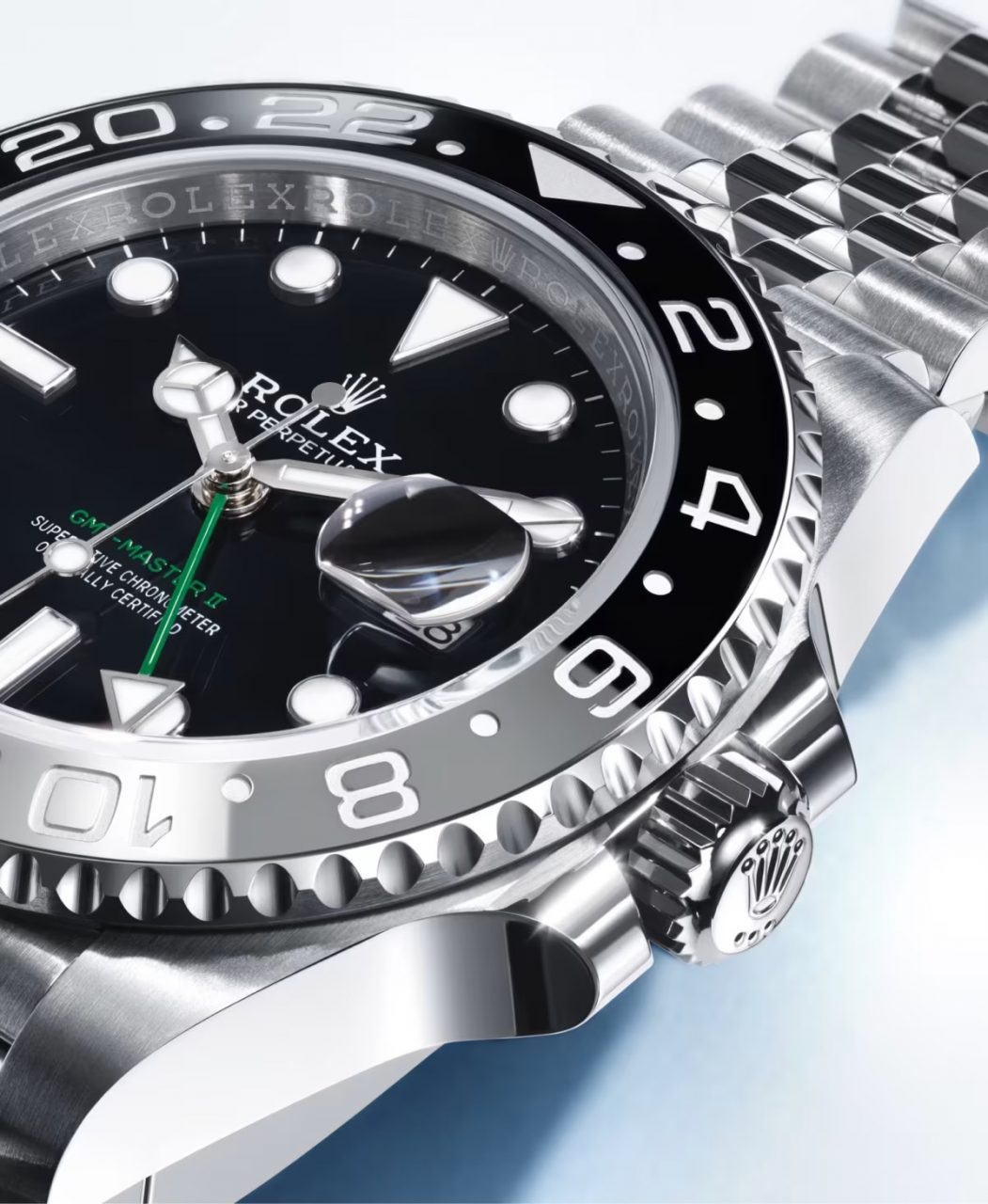 腕錶採用黑色漆面錶面,鐫刻綠色「GMT-Master II」字樣。一如所有勞力士專業腕錶,GMT-Master II無論在任何環境狀況,即使在黑暗中,獨特的Chromalight夜光顯示均能確保讀時清晰。特大指針與簡潔的三角形、圓形或長方形鐘點標記塗上夜光物料,散發持久光芒。