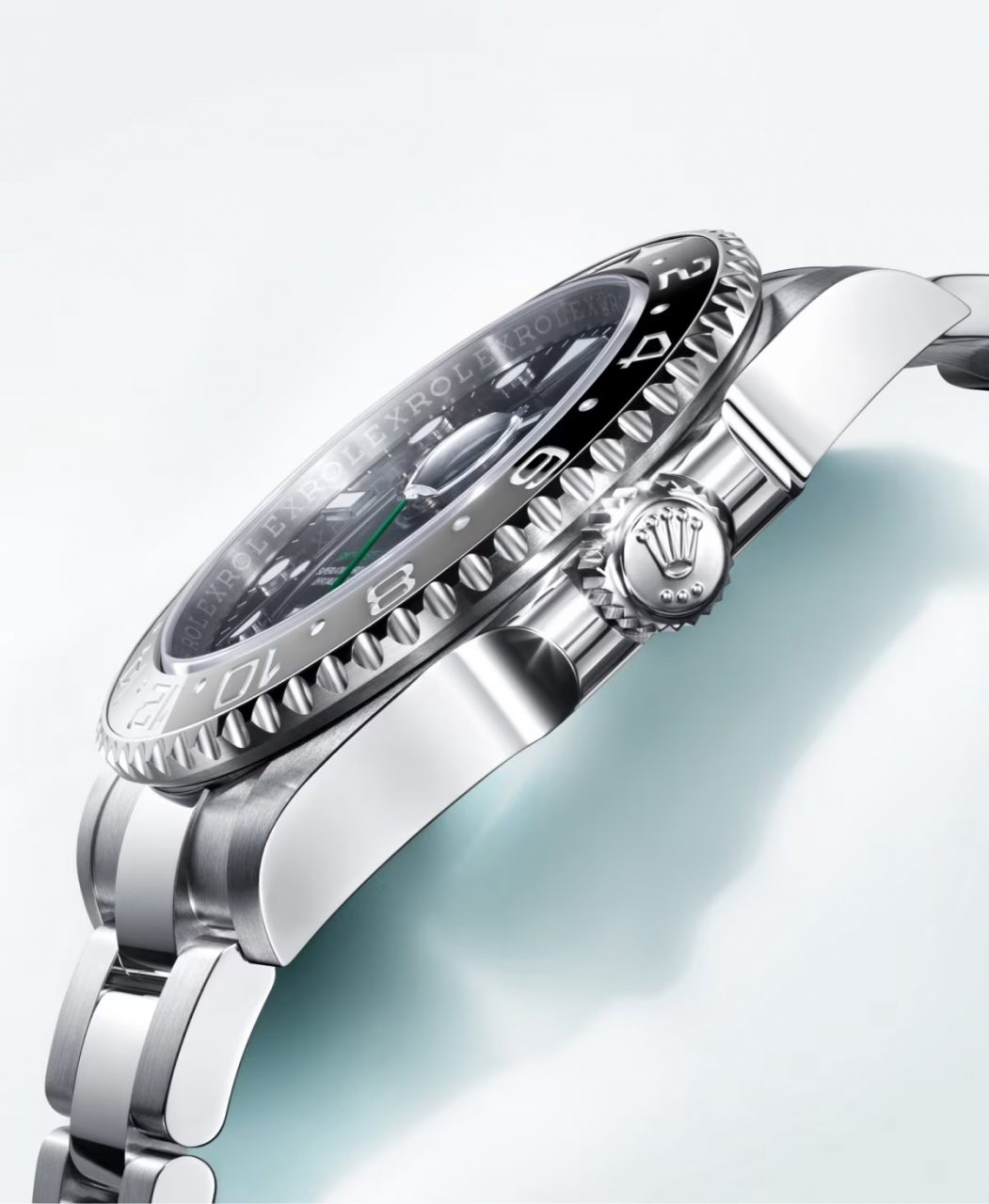 Rolex GMT-Master II鋼款腕錶首次配備灰黑雙色Cerachrom雙向旋轉陶瓷外圈,指示著第二時區時間的24小時指針則塗上品牌標誌性的綠色,與令人聯想起晝夜交替灰黑雙色外圈相映成輝。外圈上的模鑄數字與刻度均以PVD(Physical Vapour Deposition,物理氣相沉積法)鍍膜技術鍍上鉑金,清晰易讀。