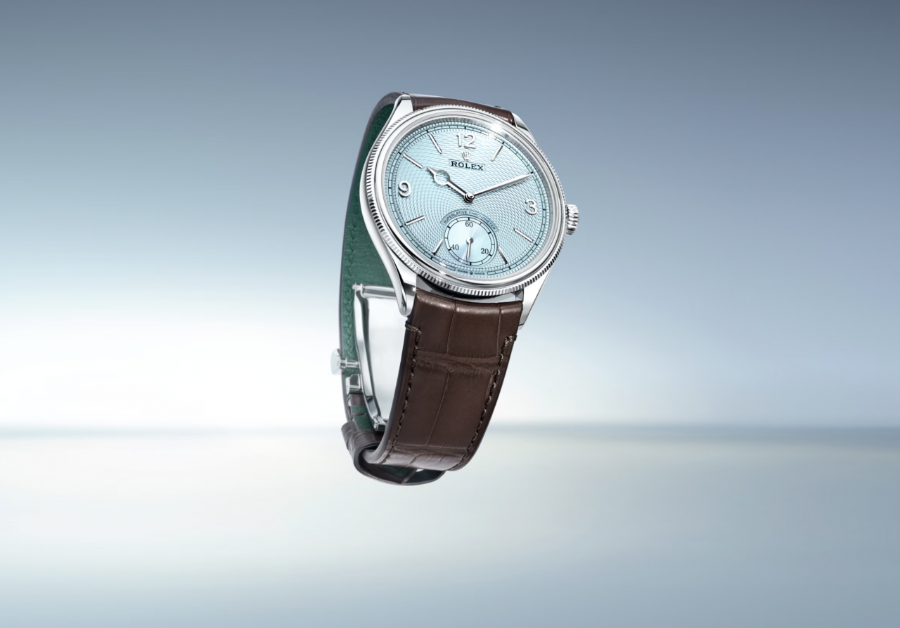 Rolex Perpetual1908腕錶系列於2023年首度亮相,擁有小三針設計和皮質錶帶,展現出獨特的正經斯文風格,彷彿一位穿上禮服的風度翩翩紳士。其尊貴定位只會採用貴金屬作為錶殼材質,而在Watches and Wonders 2024登場的最新版本則選用了世上密度最高和最重的金屬950鉑金製作39毫米錶殼,並配備飾有穀粒紋的冰藍錶面,搭載66小時動力儲存的7140機芯。專業鐘錶工匠需運用車刀雕出穀粒紋幾何圖案,其立體感在太陽光和燈光照射下顯得格外靈動活潑,向傳統製錶藝術作出致敬。