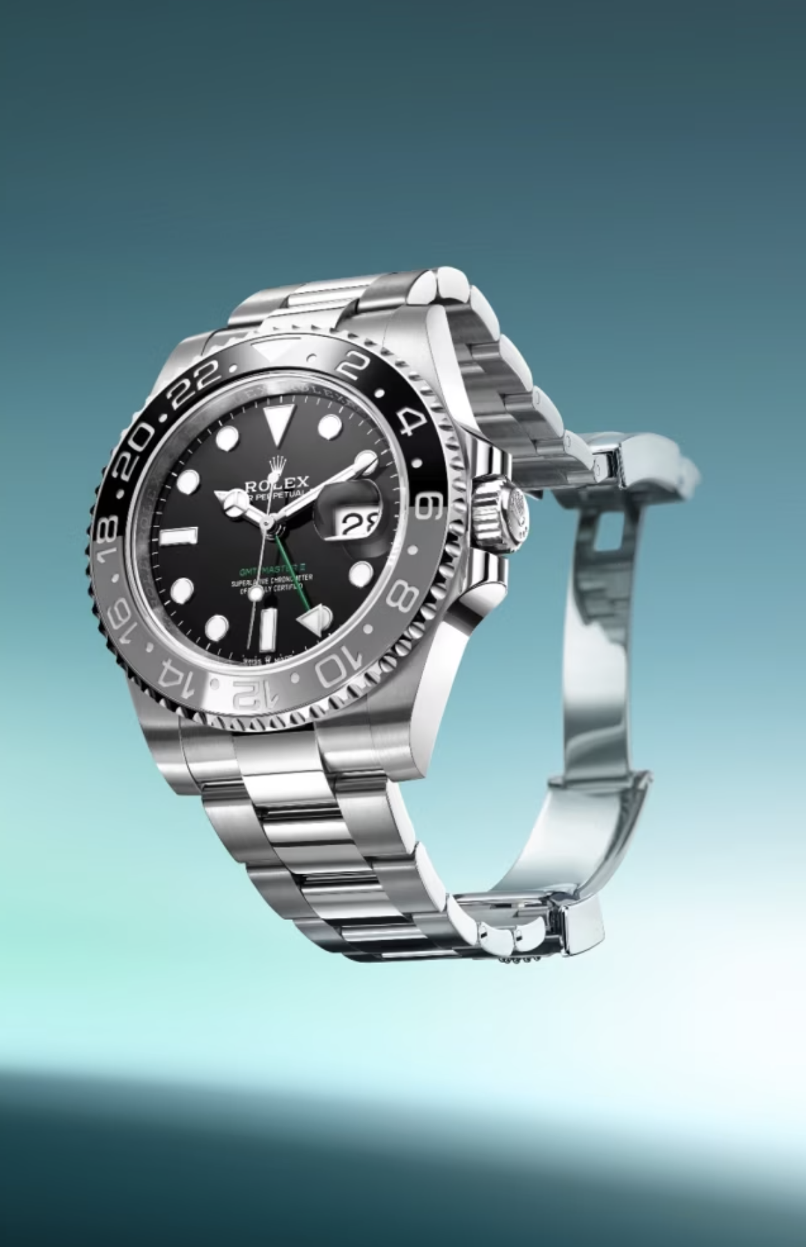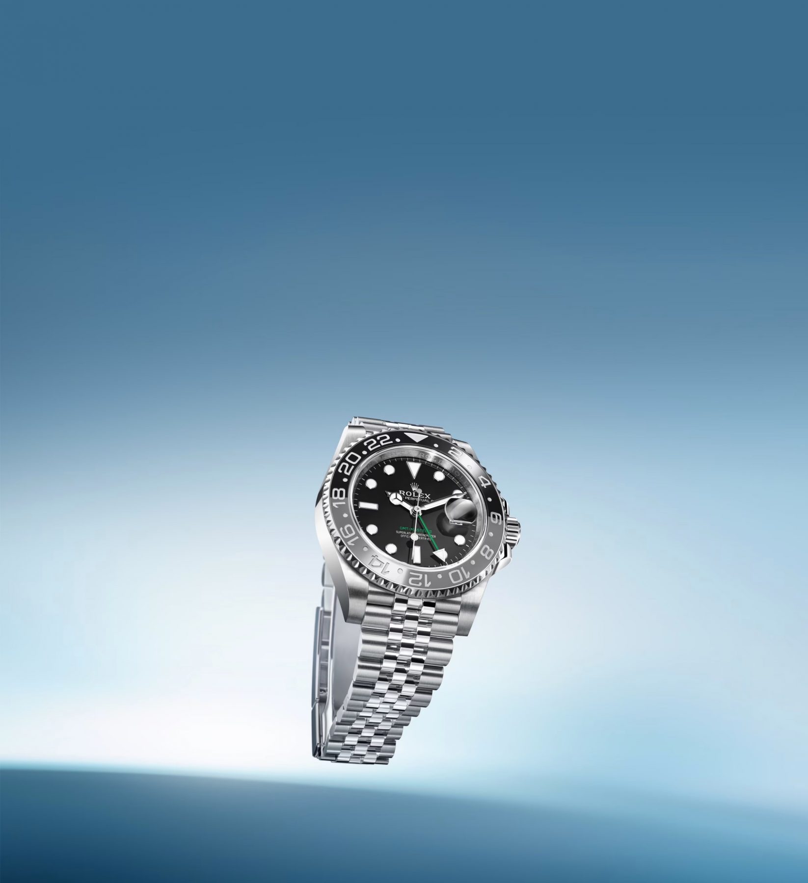 腕錶採用黑色漆面錶面,鐫刻綠色「GMT-Master II」字樣。一如所有勞力士專業腕錶,GMT-Master II無論在任何環境狀況,即使在黑暗中,獨特的Chromalight夜光顯示均能確保讀時清晰。特大指針與簡潔的三角形、圓形或長方形鐘點標記塗上夜光物料,散發持久光芒。